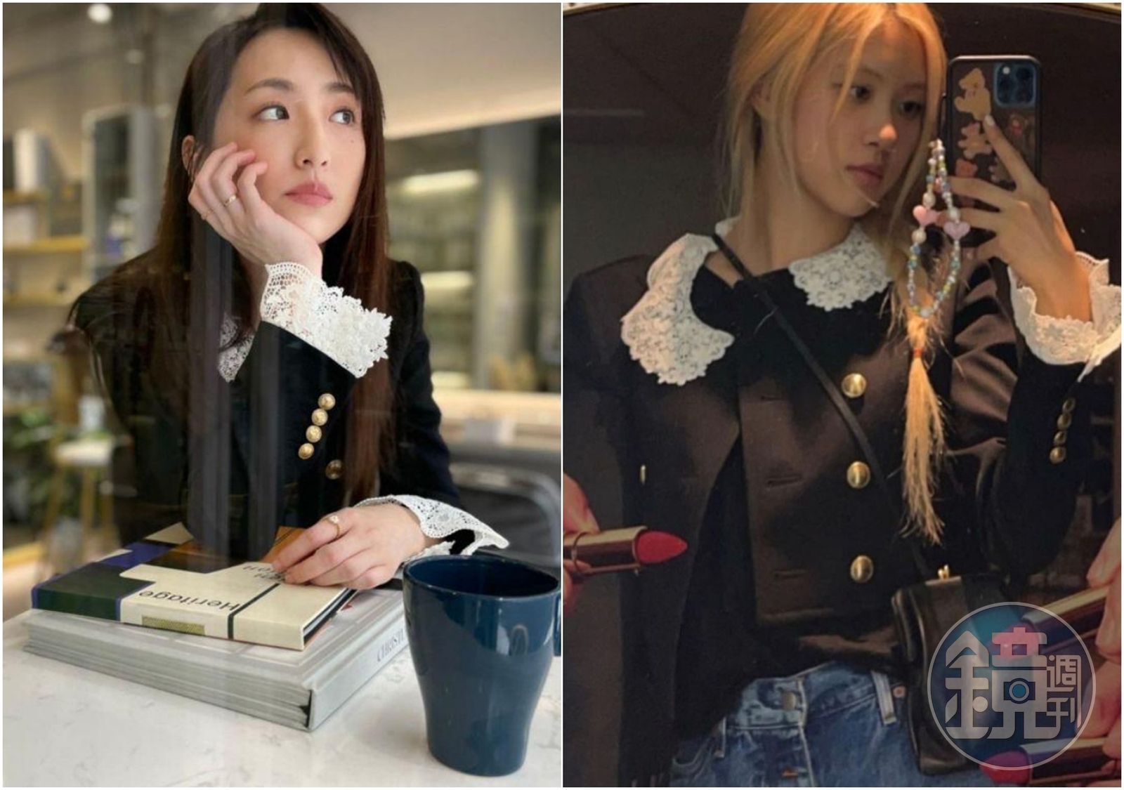 (左起)柯佳嬿的氣質look與ROSÉ隨性穿法,詮釋出黝黑色拼接蕾絲刺繡獵裝外套的不同面貌。發布時間:2021.08.25 21:07 臺北時間