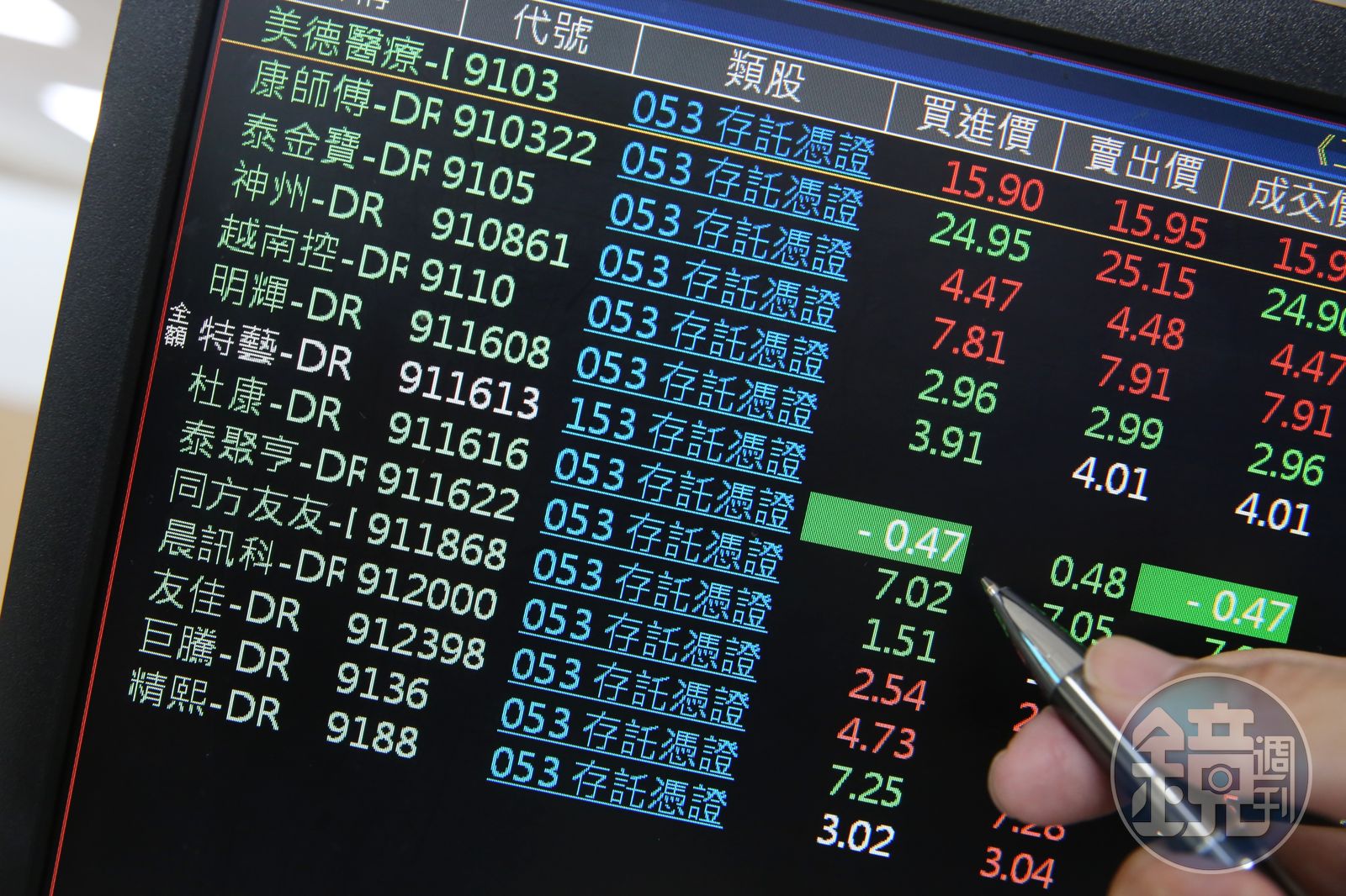 不過,黃文清強調,不是說所有DR股都不好,像是目前比較熱門的美德醫療DR、泰金寶DR,市場上仍有相當程度的交易量,若投資人對公司產業概況熟悉,甚至對內部營運有所了解,DR股是一個能快速參與海外公司行情的投資工具。不過,對一般人來說,若沒有追蹤依據,如市場報告、公司營收概況等資料,建議還是審慎看待。