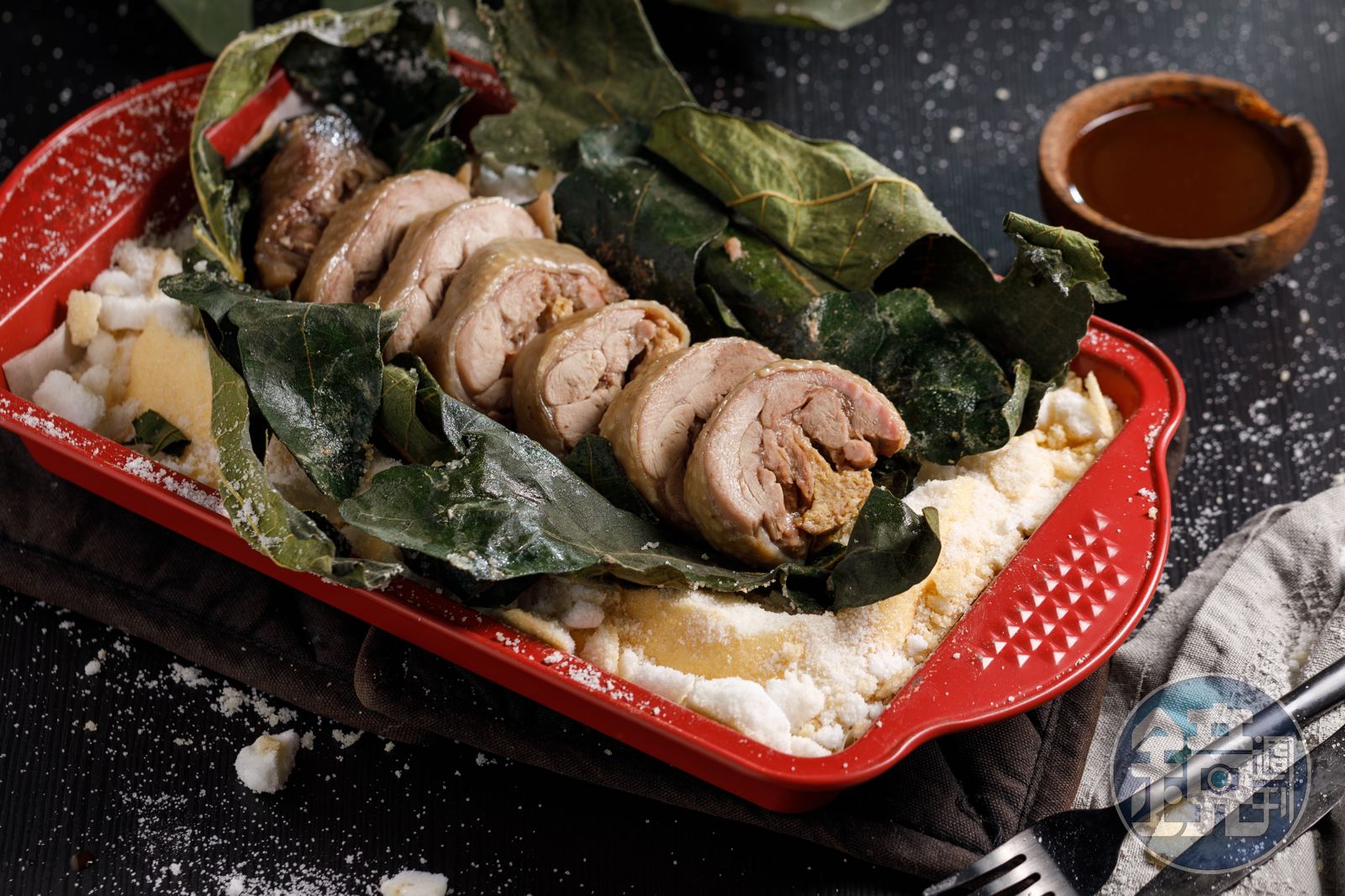 與餐廳聯名推出「香色那可那可雞」,除了鹽滷煙燻的雞腿、肉泥慕斯,連製作鹽焗的蛋白、鹽巴,和小道具棉繩、烤盤紙都有。Thomas拿起無花果葉說:「每一個食譜食材箱都有一個亮點食材,讓特別的食材不只在餐廳吃得到,也能進入居家餐桌。『香色』裡的是無花果葉,烤出來有椰子香氣。」把比手掌還大的無花果葉,穿插交疊像編織籃子,鋪成2張大網,裹住以棉繩固定的雞捲肉,再蓋上厚厚一層鹽焗被子送進烤箱,敲開鹽焗開吃,大野山雞腿彈性十足,搭配牛骨醬汁,用無花果葉襯底擺盤,就是一道自帶光環的大菜。