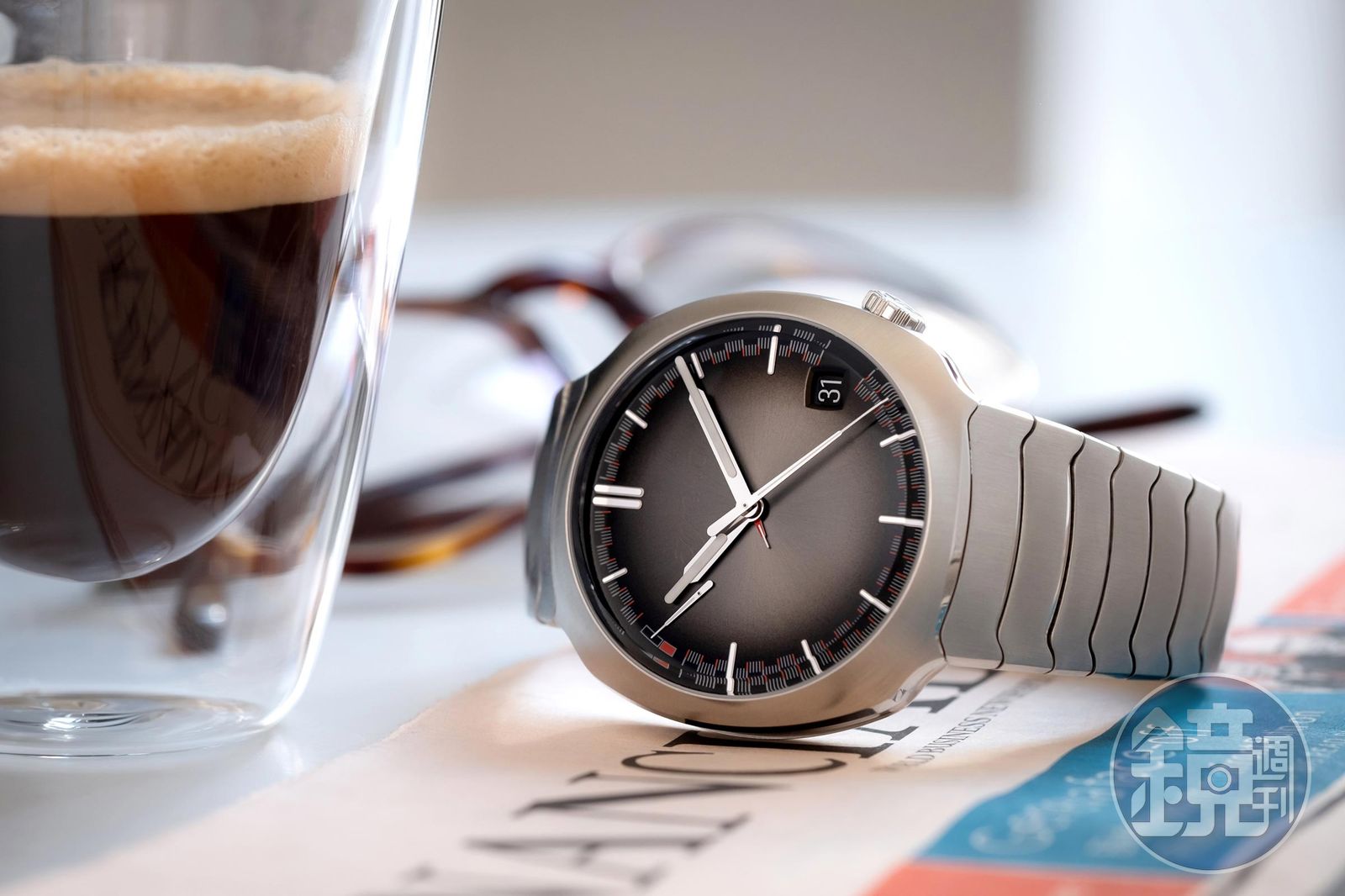 同時日期視窗也做得比以前來的更小,而且動力儲存指示區塊也是相同的情況,加上移到中央的秒針,在目前疾速者系列的三款作品都有相同的設計邏輯,就是讓面盤的元素盡量減少,面盤盡量簡潔俐落,讓手錶從錶帶、錶殼到面盤都保持著一貫的流線造型。煙燻面則是亨利慕時另一個招牌設計,而且品牌刻意把12點鐘的Logo作成隱藏式,這是延續年初Mega Cool腕錶的作法。
