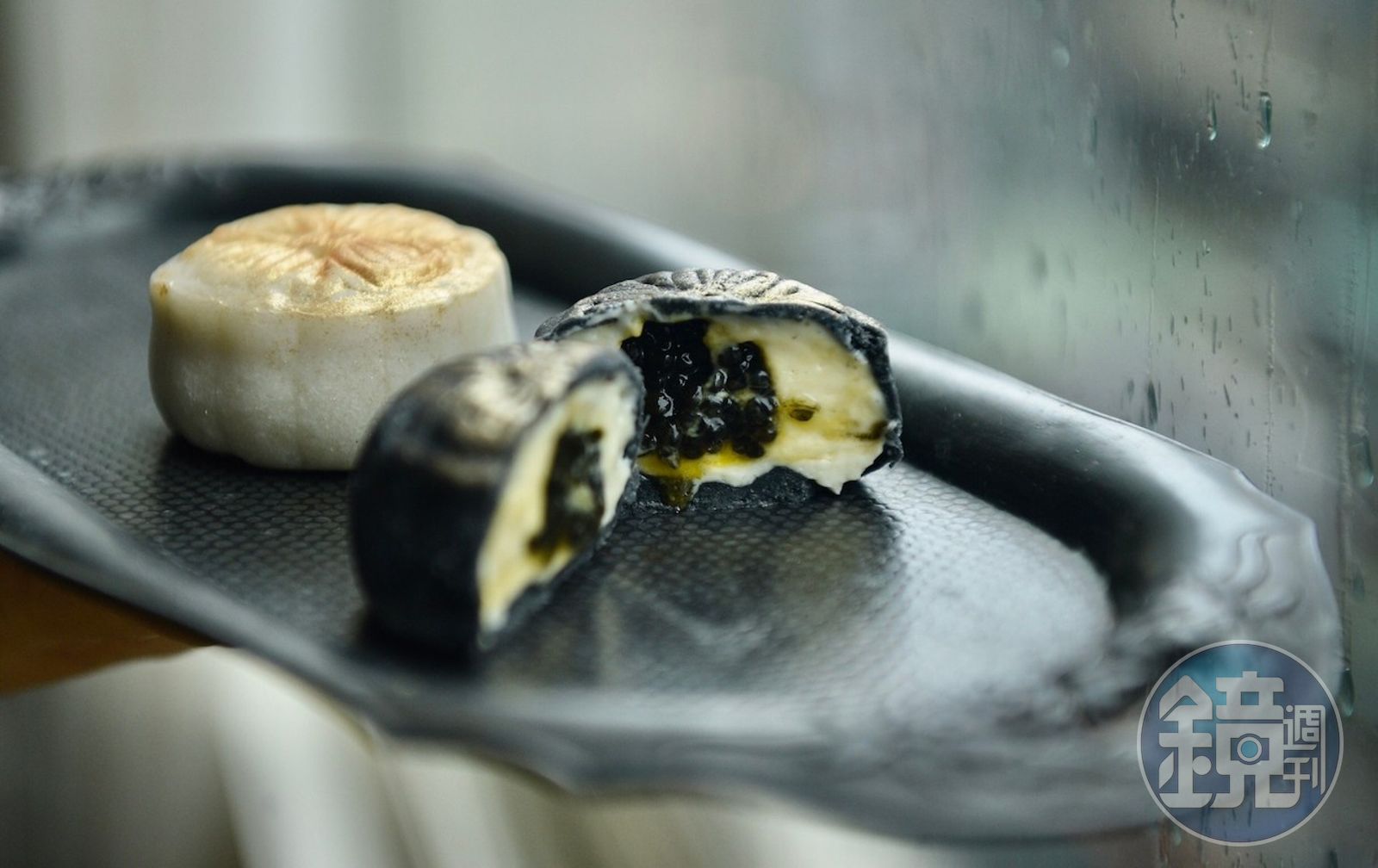 魚子醬月餅分成黑白兩色都有6克以上魚子醬,黑色月餅包入奶油乳酪、白色月餅包入馬達加斯加香草奶餡,香滑濃郁、鹹甜交織。