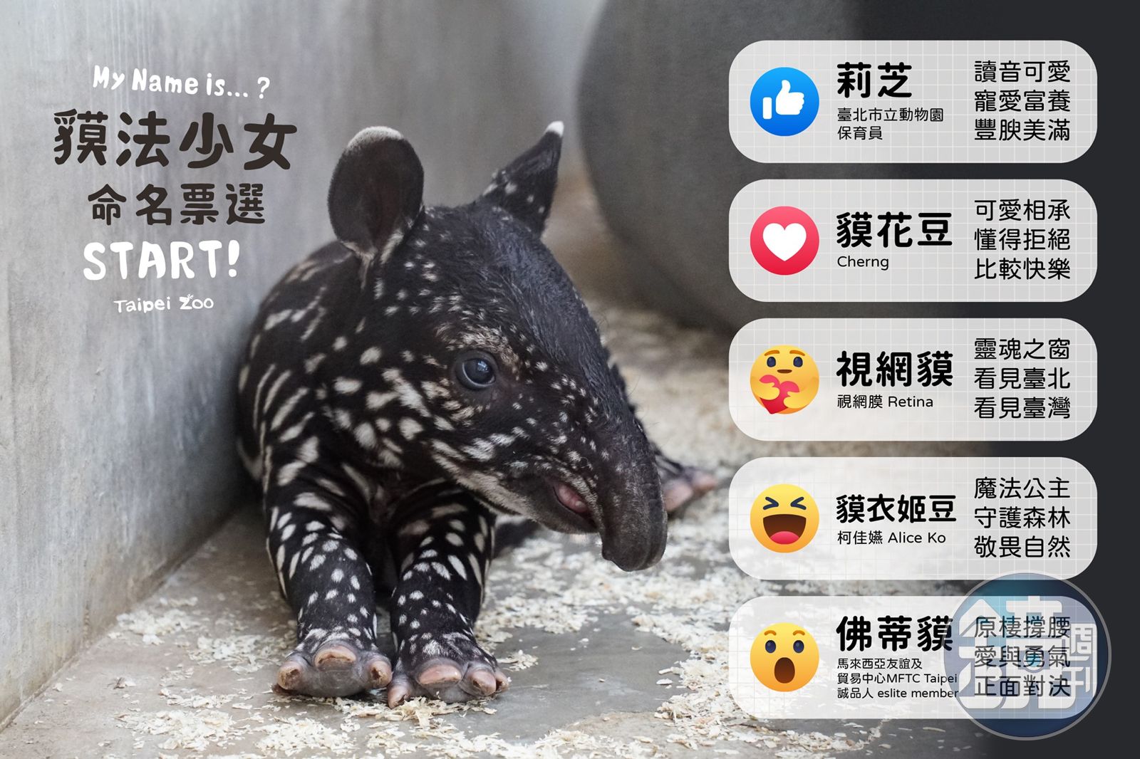 台北市立動物園今選出5個被提名的名字,分別為由動物園保育員取名的「莉芝」,意義為讀音可愛、寵愛富養、豐腴美滿;插畫家Cherng取名的「貘花豆」,意旨可愛相承、懂得拒絕、比較快樂;Youtuber視網膜取名的「視網貘」,意旨靈魂之窗、看見台北、看見台灣;演員柯佳嬿取名的「膜衣姬豆」,意旨魔法公主、守護森林、敬畏自然;連鎖書店誠品取名的「佛地貘」,意旨原棲撐腰、愛與勇氣、正面對決。
