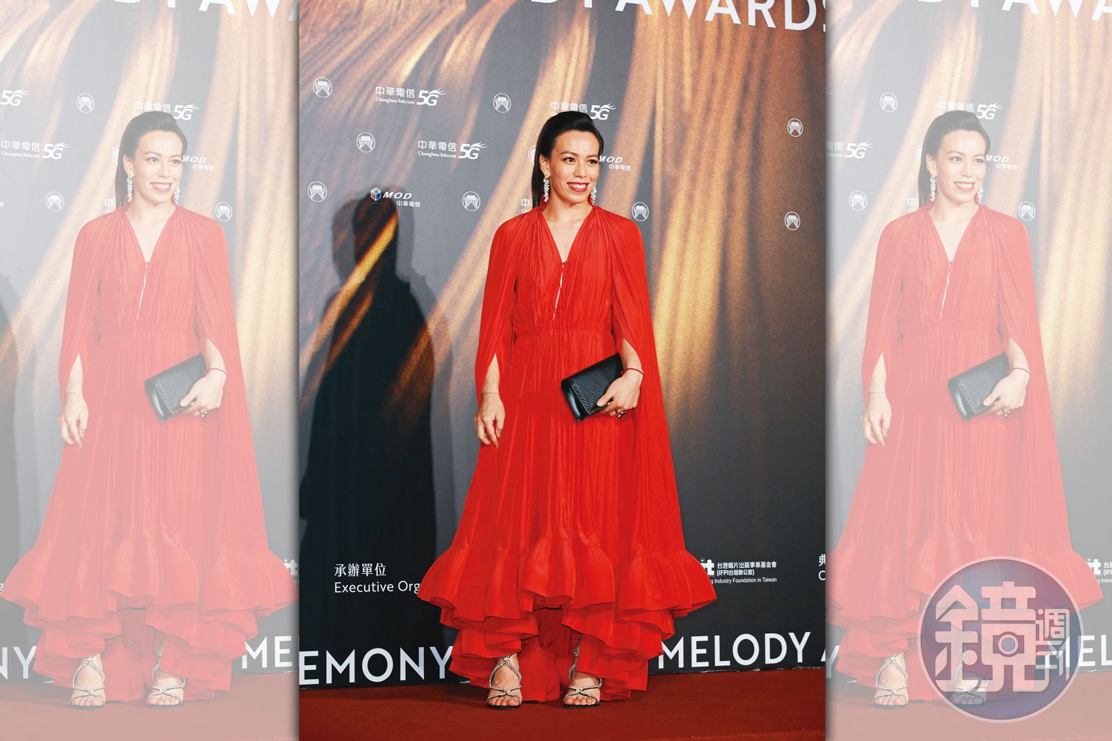 唯一可再議的是,這件Lanvin禮服結合了雪紡、斗篷、傘狀、抓縐及前後不對稱設計,視覺感太大、細節太多,加上長耳環裝飾,重點太多,人很容易被衣服「吃掉」。