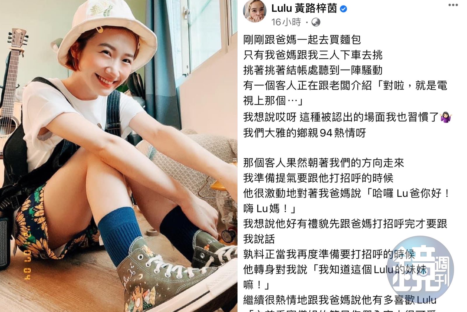 Lulu頂著大素顏與父母去買麵包被粉絲當成Lu妹直接忽視。(翻攝自Lulu 臉書)發布時間:2021.08.31 12:08 臺北時間