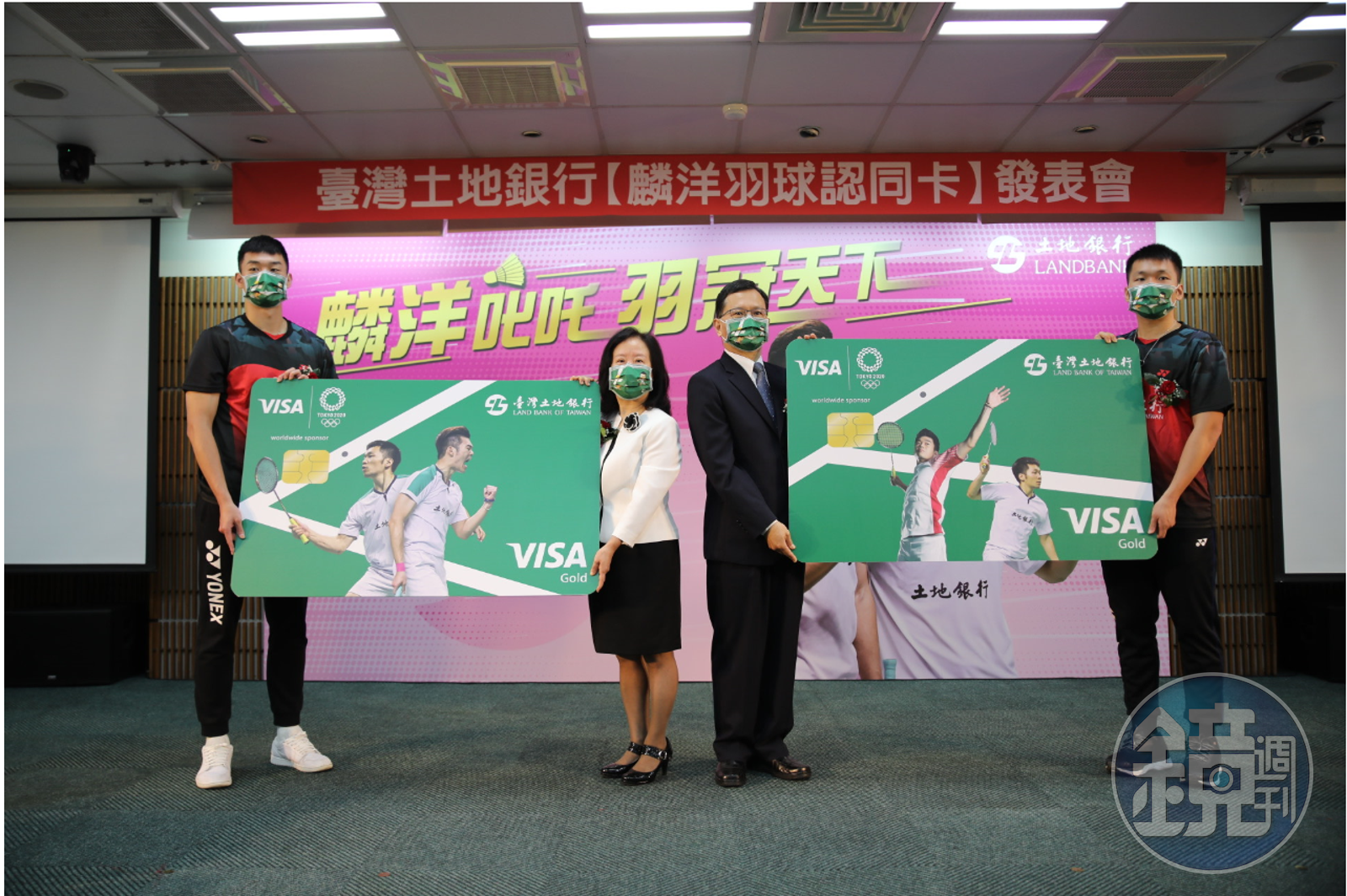 土地銀行今(8/31)宣布發行麟洋羽球認同卡,由土銀董事長謝娟娟(左2)、總經理何英明(右2)偕同王齊麟(左1)與李洋(右1)進行揭卡儀式。(土銀提供)發布時間:2021.08.31 12:57 臺北時間