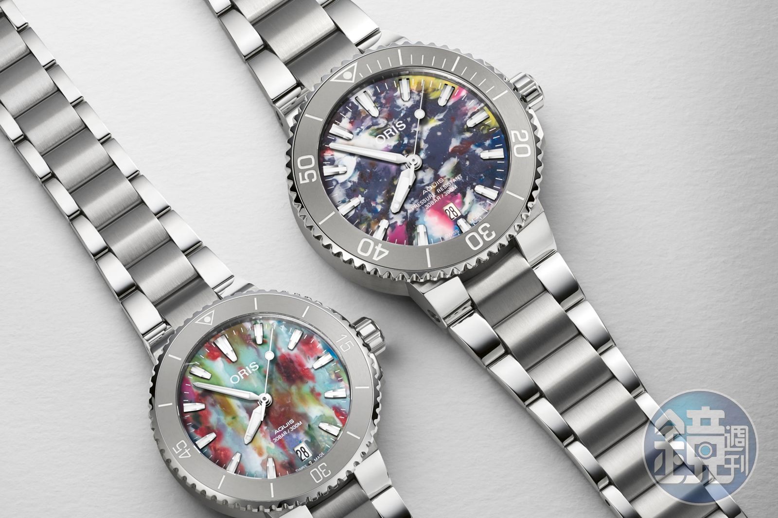 Aquis Upcycle日期錶此次非限量販售,有41.5mm跟36.5mm兩種尺寸,也由於是回收塑料的緣故,因此會產生隨機的圖案紋路,每一款都獨一無二。錶殼材質為不鏽鋼,至於單向旋轉錶圈則是鑲嵌灰色陶瓷刻度部件,錶款裝載 ORIS 733自動上鏈機芯,防水達300米,建議售價NT$64,000。