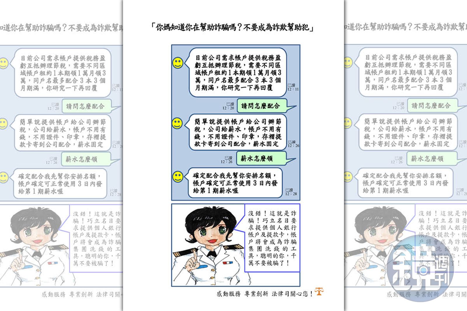 《國軍法律事務網》以幽默插畫提醒國軍弟兄別成為詐欺幫助犯。(國軍法律事務網)