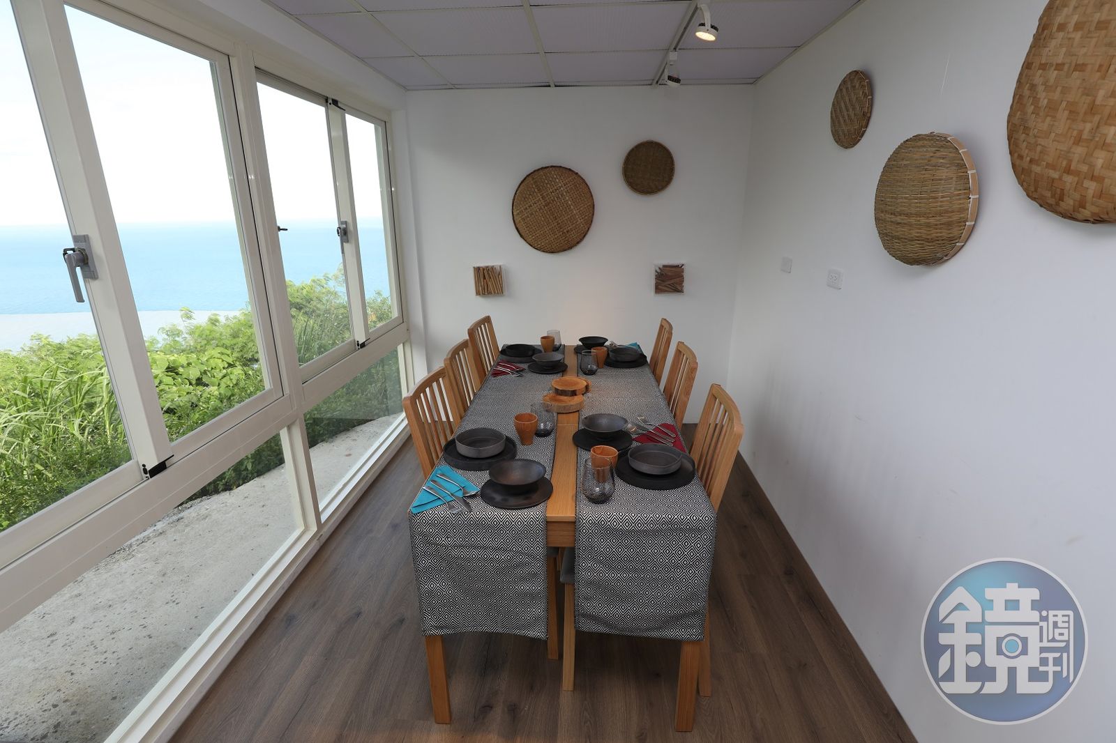 進入芙瀨實驗廚房,最吸睛的莫過於它的開闊視野,上方有一條可俯瞰青山、海洋的天空步道,步道下方是兩個貨櫃包廂「山芙廳」與「水瀨廳」,裡頭是可容納6人的用餐空間,內部還特別闢出展覽場域,目前正在展出台東工藝家林精哲向排灣陶壺致敬的《黫山水器》,也是這次芙瀨所使用的食器。