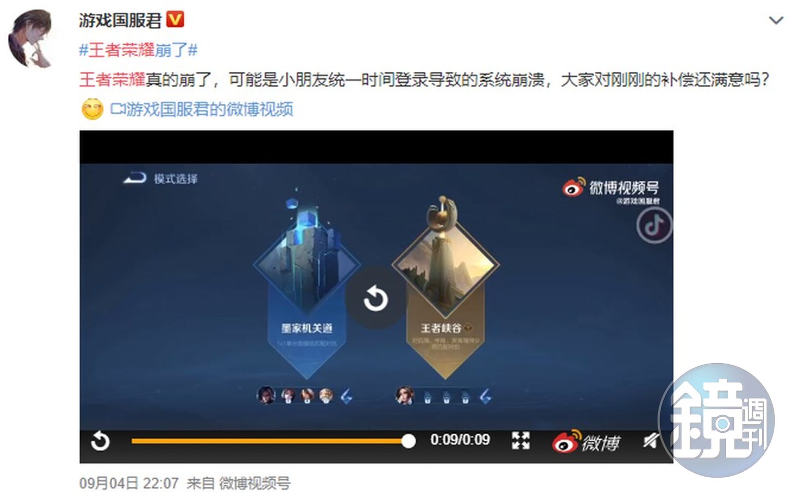 針對青少年玩遊戲的新法規實施第一個週末,4日晚上時間一到,大批青少年立刻登入騰訊的熱門手遊「王者榮耀」,沒想到太多人同時上線導致伺服器崩潰,不管是成年人還是青少年大都無法登入,成功進入遊戲的玩家也出現積分消失、排位異常的狀況。許多未成年玩家好不容易登入遊戲後,系統立刻顯示「9點應下線」,什麼都沒有玩到。