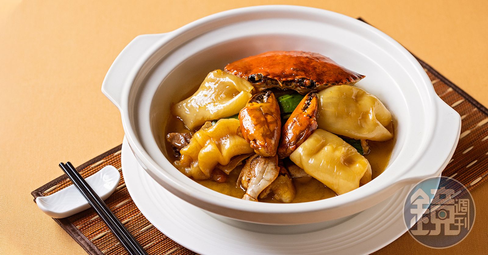 天氣漸涼,也意味著適合大啖肥美螃蟹的季節即將到來。主廚將鮮嫩土雞與肥美紅蟳一同煲煮,將花膠的膠質完美釋放。