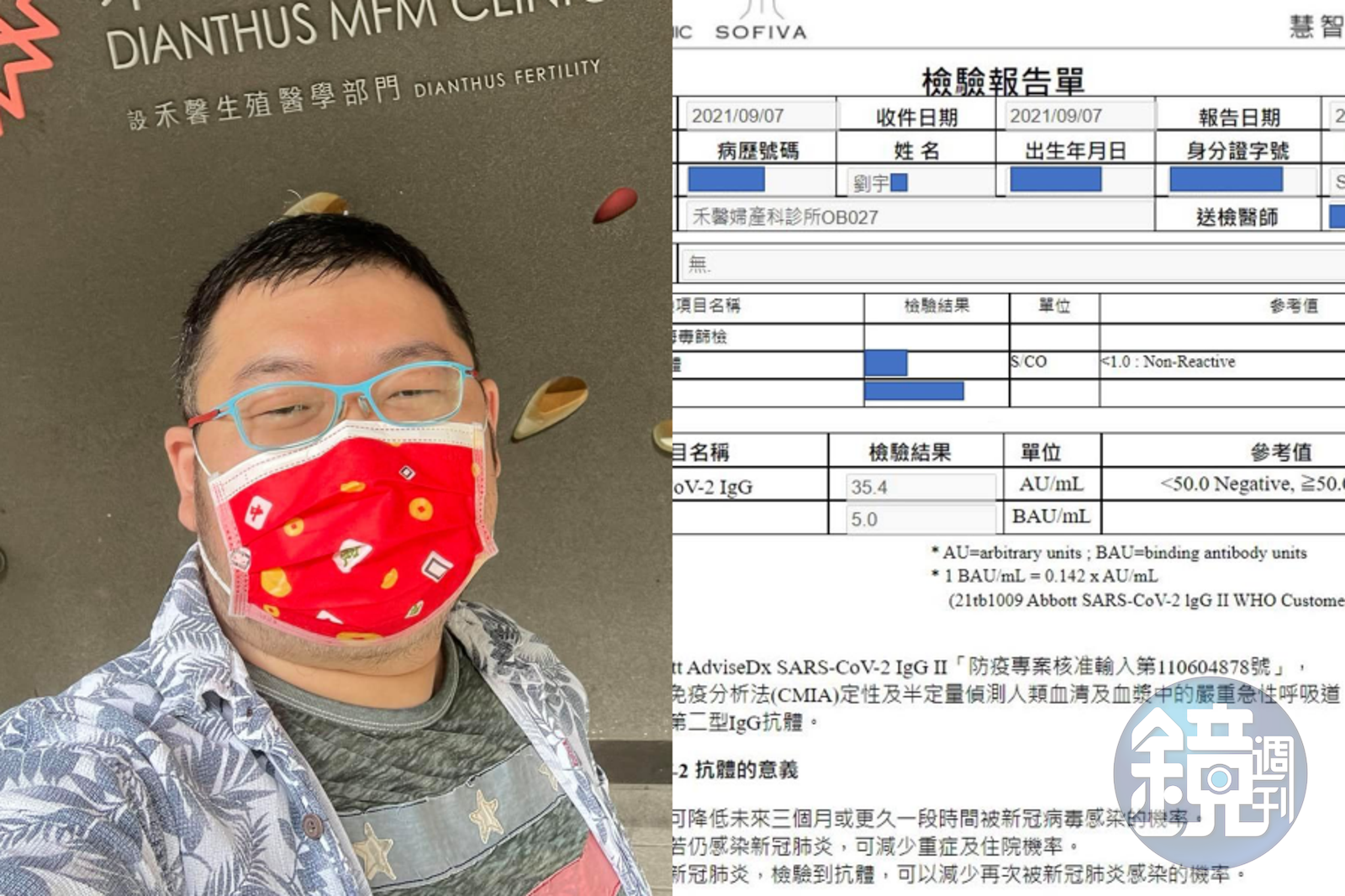 施打完高端疫苗15天後,四叉貓昨(7日)自費前往禾馨診所檢驗抗體,並且今日於臉書公布檢驗報告,結果顯示其IgG數值是35.4 AU/mL,抗體數值偏低,參考數值是應該要50以上。不過四叉貓猜測,50應該是指兩劑,而換算後的5.0 BAU/mL則應該是世界衛生組織(WHO)使用的單位;劉宇也稱結論為「有產生抗體但數值偏低」。
