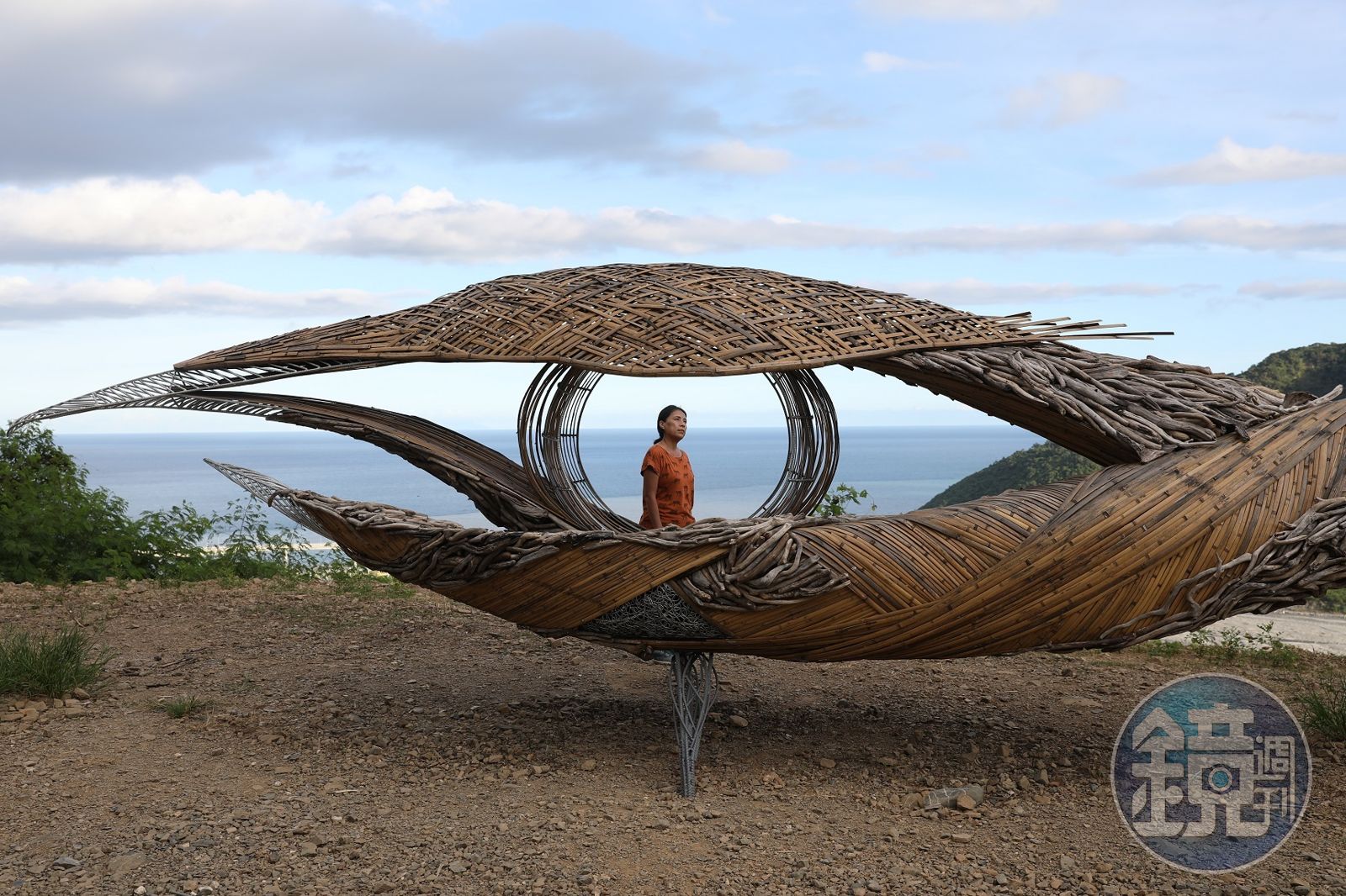 藝術家陳淑燕與杜瓦克都耀合力創作的《在斜坡上的瞭望》,選擇落腳在山上的金崙舊部落。順著蜿蜒小路,一路往山上走,最後來到一處空地。創作者在斜坡上以漂流木、竹子、鋼筋與鐵線等多元素材,編織出一只如鷹隼般銳利的力量之眼,下方則是令人屏息的開闊美景,可眺望金崙溪出海口與金崙部落;馳騁海上的高架金崙大橋和橫跨溪流的南迴鐵道,望向海洋的眼睛,彷彿也正在守護眼前這片山林河谷與部落。