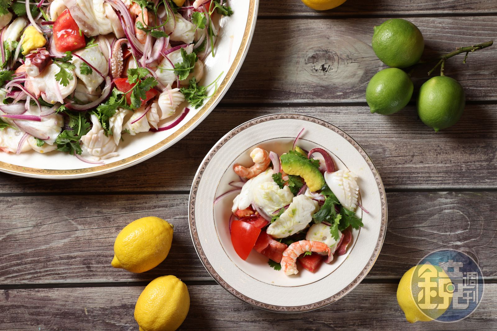 我用黃色的萊姆和自家花園栽植的香水檸檬調製酸汁,真鯛切片撒鹽靜置,然後浸入酸汁放進冰箱。燙熟蝦仁、透抽、章魚腳,浸入冰塊水中,使其肉質Q彈。酪梨切片、番茄切塊、香菜粗切、紫洋蔥切絲。