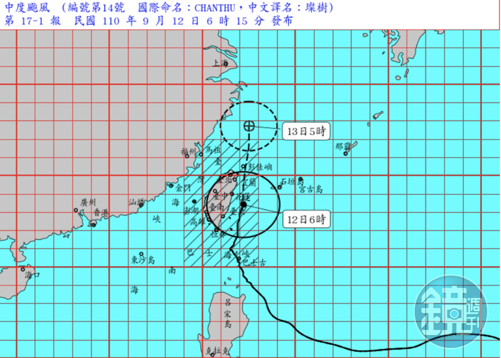 中央氣象局預報指出,璨樹颱風中心目前在花蓮東南方海面,向北移動。(取自中央氣象局)發布時間:2021.09.12 06:34 臺北時間