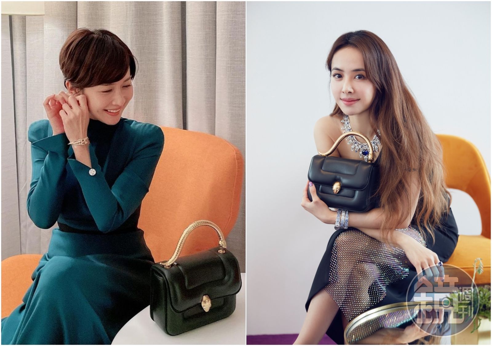 (左起)曹如晶、蔡依林雖然時隔半年,但是都同樣看上BVLGARI x Mary Katrantzou的Serpenti Metamorphosis手提包。發布時間:2021.09.12 08:08 臺北時間