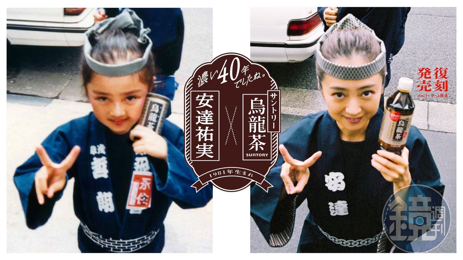 日本知名飲品SUNTORY(サントリー)烏龍茶歡慶40週年,邀來同樣在1981年誕生的安達祐實合作,完美重現安達兒時手拿該品牌的照片,不但髮型穿著相同,背景街道、安達祐實的表情及手勢、拍攝角度都完美復刻,品牌更選在安達生日當天(9/14),於日本便利商店販售與當年同樣口味、包裝設計的復刻版烏龍茶。