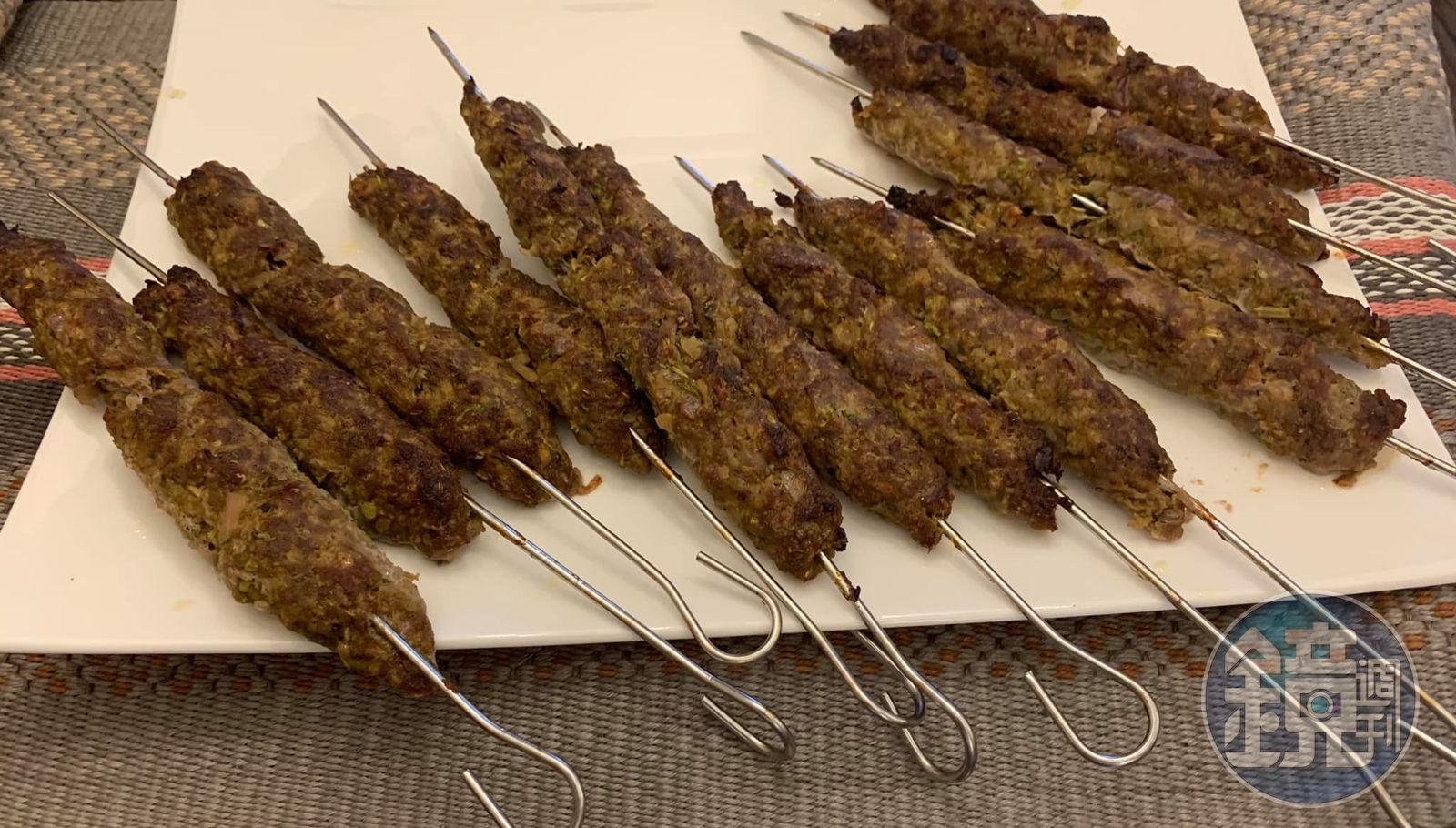 試味後捏成一個小孩拳頭大小肉丸,然後用鐵籤串之,順勢捏成黒輪圓條狀。烤箱上下火攝氏160度,將羊肉串平鋪在架上,20分鐘後轉上火攝氏250度5分鐘,讓肉串微焦即可取出。這就是烤羊肉串,記憶中的埃及風味。