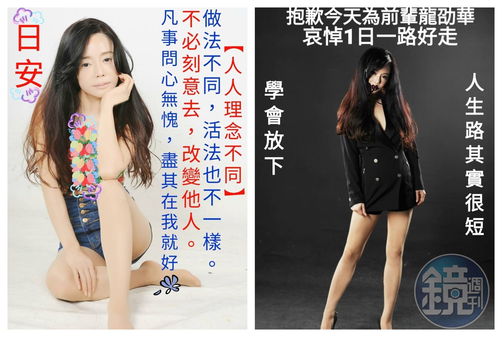 狄鶯昨(15日)一早在臉書發出一張長輩圖,上面寫有:「抱歉今天為前輩龍劭華哀悼1日一路好走,人生路其實很短,學會放下。」照片中她大玩「下身失蹤」,穿黑色低胸西裝、超短熱褲,露出修長雙腿,相當火辣。