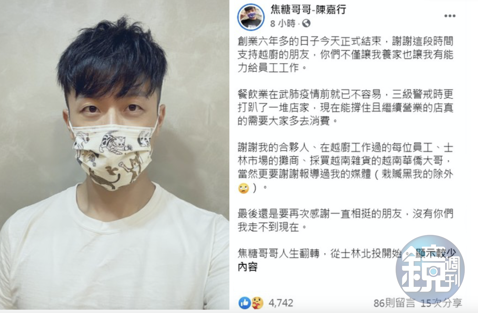 焦糖在臉書上寫著「創業六年多的日子今天正式結束,謝謝這段時間支持越廚的朋友,你們不僅讓我養家也讓我有能力給員工工作。餐飲業在武肺疫情前就已不容易,三級警戒時更打趴了一堆店家,現在能撐住且繼續營業的店真的需要大家多去消費。」
