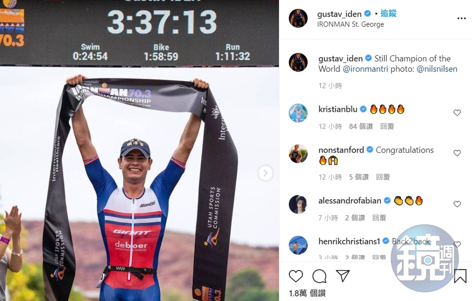 台灣時間19日凌晨1時左右,伊登在鐵人三項世界錦標賽70.3英里(113公里)項目中,騎著代言的台灣捷安特,衝向終點時頭上緊戴埔鹽順澤宮帽,露出燦爛笑容,最終以游泳1900公尺24分54秒、單車90公里1小時58分59秒、跑步21.1公里1小時11分32秒,總和3小時37分13秒的成績,成功衛冕男子組冠軍。