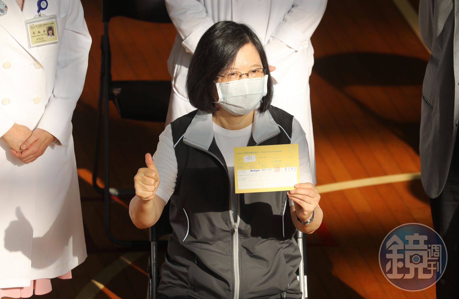 蔡英文在8月23日帶頭施打高端疫苗第一劑,當時媒體問蔡會不會緊張?蔡說不會,還比了ok手勢,施打後也在臉書上「報平安」;賴清德是在8月27日接種,被問到打完疫苗會不會肚子餓,他則笑回「我早上有吃飯」。