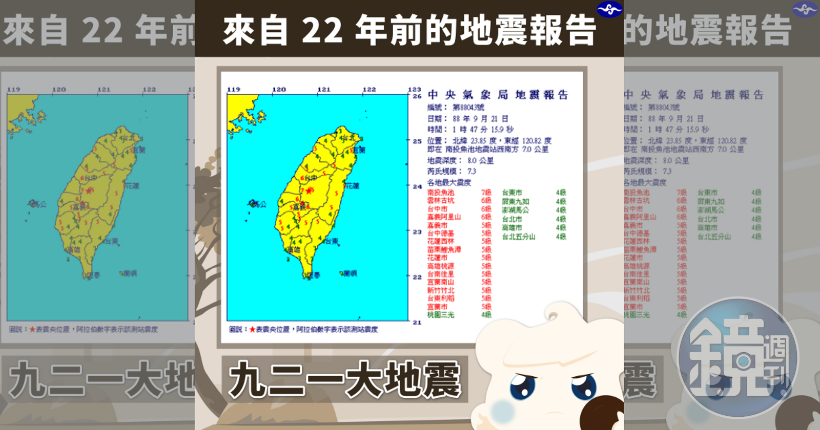 「那是最殘忍、最恐懼的記憶」,氣象局表示,1999年9月21日凌晨1點47分,芮氏規模7.3的地震帶來了歷史性的災難,車籠埔斷層斷層的錯洞,彷彿為台灣地表帶來一道長達105公里的傷痕,這場極淺層的世紀大震,造成逾2,400人罹難、近10萬棟房子倒塌,總計損失超過3,000億元,即便在現在重看當時的地震報告,似乎還是能看到許多台灣人心底最難抹滅的痛。