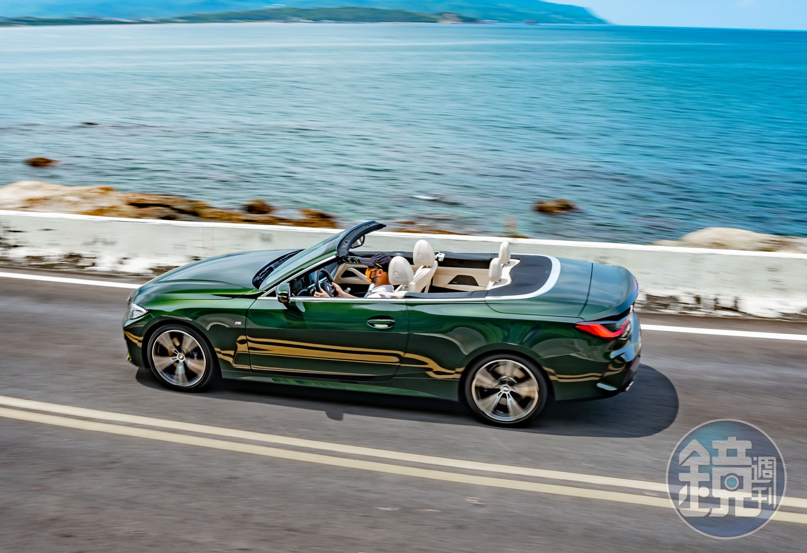 不過即便430i Convertible M Sport確實是部戰力堅強的後驅狠角色,但既然弄到了一部這樣的好貨色來試駕,當然是要開蓬往海邊慢慢走,在悠閒的步調下,一邊享受眾人的目光浴、一邊感受著爽朗的陽光與新鮮的海風,雖然因為防疫的關係而必須戴上口罩,但依然不減開著這部上空尤物遊車河的好興致。少了車頂再把車窗全部放下,以往只能透過車身感受到、有些隔靴搔癢的駕馭感受,在此刻都更為真實的由身體五官來感受;在彎角前輕踩煞車並扯動方向盤,後輪的輕微打滑伴隨著輪胎的小小尖叫聲,方向的改變讓吹拂在臉頰上的風也跟著變了;潑辣的陽光讓我汗滴止不住的流下,但清新的海風依然讓我樂此不疲。