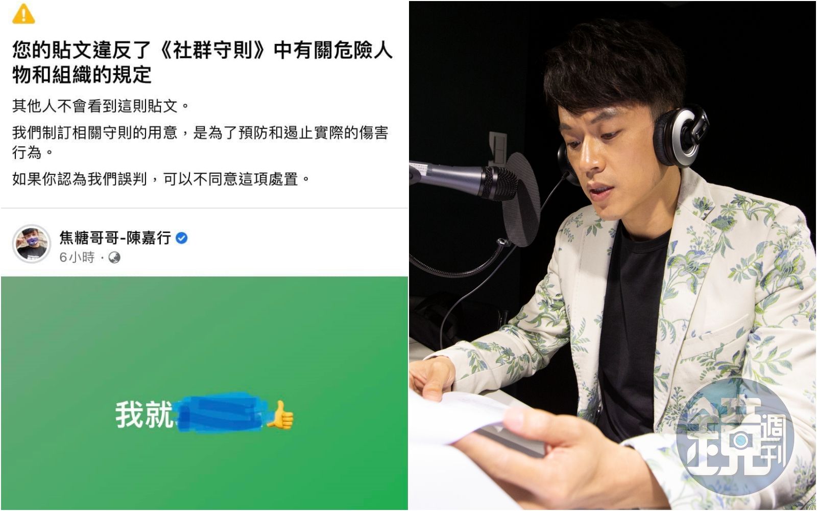 對於被朱學恒、高虹安等人持續用「塔綠班」嘲諷,向來力挺綠營的陳嘉行對於這樣的說法起先不以為意,po文反擊表示「我就塔綠班」,不料卻立刻被臉書警告,指出他的貼文已經為了社群守則中關於「危險人物和組織的規定」,並將該則貼文隱藏,「我們制訂相關守則的用意,是為了預防和遏止實際的傷害行為」。