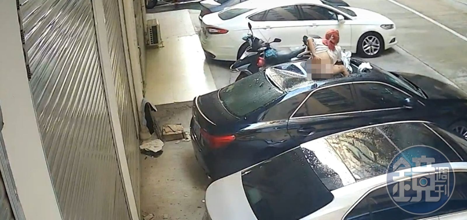 影片中顯示,女子意外墜樓,從天而降摔在黑色車子上,導致天窗、車頂板金全壓垮,還看出女子的腳已插陷進車裡,可見力道非同小可。