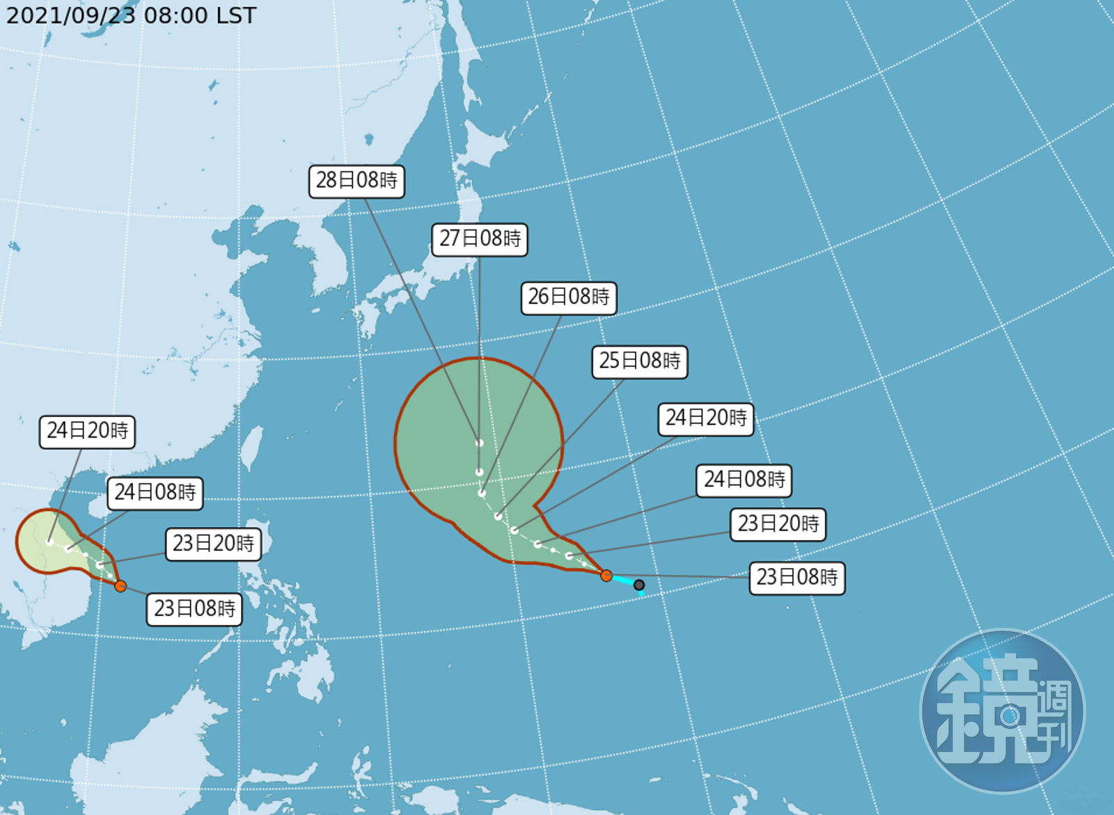 中央氣象局預報員朱美霖說明,目前南海及關島東南方海面上有2個熱帶性低氣壓,關島的熱帶低壓於昨(22日)下午2點形成,海溫條件高,垂直風切不大,有利發展為颱風,其路徑未來朝西北西移動,預估明(24日)、週六(25日)往北迴轉接近日本;另外,南海的熱帶低壓今早8點形成,1、2天內朝中南半島前進,有成颱趨勢,不過登陸後強度就會減弱。