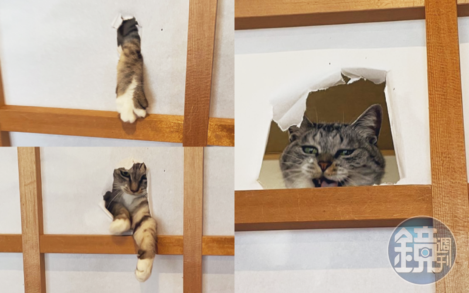 日本有位貓奴家中有一對姊妹貓,特別愛破壞家中和式障子門的門紙,飼主因此將門紙完全拆下好一段時間。近日想再挑戰看看把新門紙黏上,沒想到都還沒完工,貓咪就趕來加工,快速抓破個大洞還從洞口露出得意的賊笑,網友笑稱:「就是犯罪者的表情!」「根本惡魔的微笑啊~(怕)」