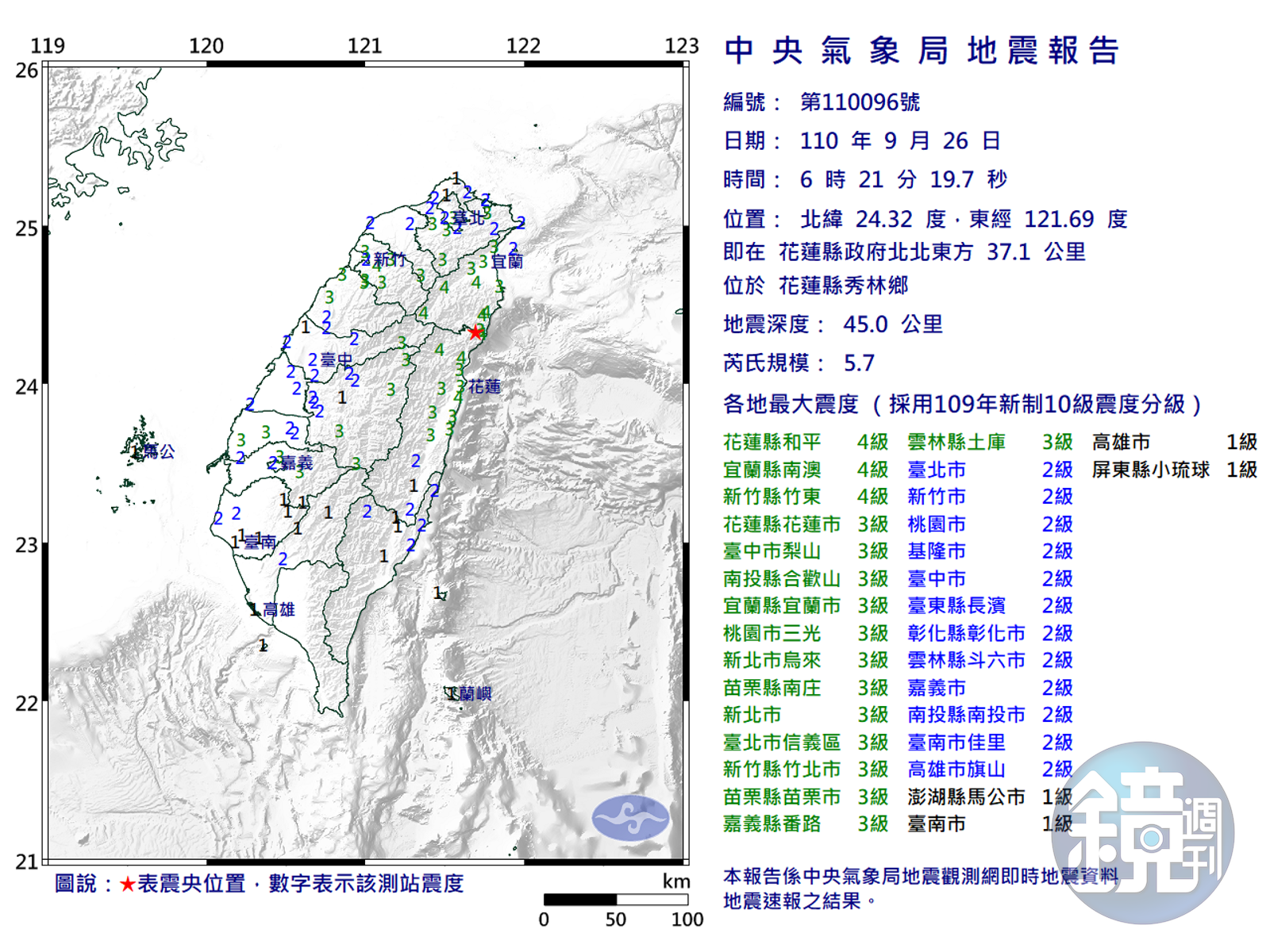 根據中央氣象局最新資料研判,地震震央位於北緯 24.32度,東經 121.69度,即在花蓮縣政府北北東方37.1公里 ,位於花蓮縣秀林鄉,地震深度為45公里、芮氏規模5.7。 最大震度達4級的地區包含花蓮縣、宜蘭縣及新竹縣;台中市、南投縣、桃園市、新北市、苗栗縣、台北市、嘉義縣及雲林縣最大震度則達3級;新竹市、基隆市、台東縣、彰化縣、嘉義市、台南市及高雄市最大震度達2級;澎湖縣及屏東縣最大震度為1級。