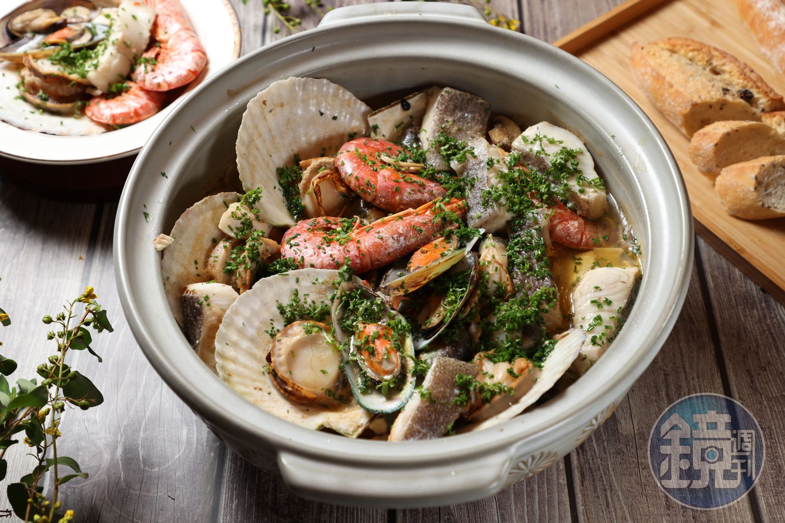 材料:大比目魚1尾(取肉切塊,魚骨也切塊)、天使紅蝦10尾、扇貝12個、淡菜20粒、蒜頭6顆切片、洋蔥半個切末、紅蔥頭6顆切片、蘑菇10粒切片、不甜的白酒1瓶、奶油半條、雞高湯1包、巴西里切碎末、蝦夷蔥切細末。