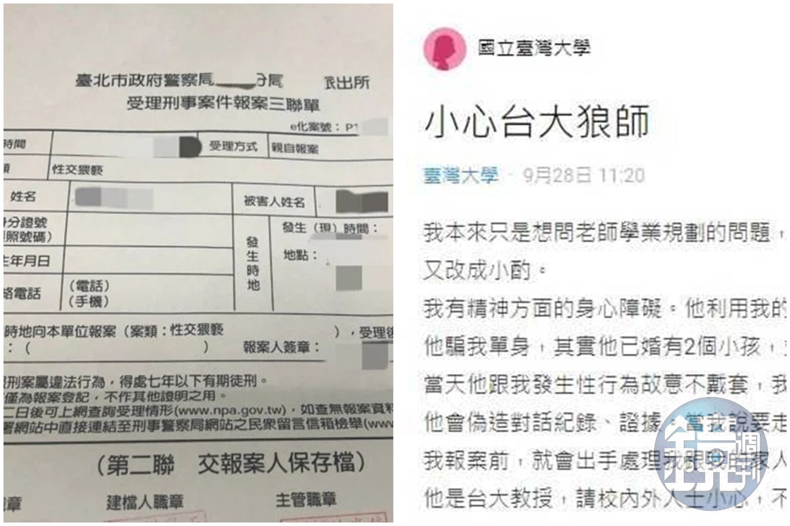原PO在Dcard上放上幾張與教授對話紀錄截圖,指控已婚、有小孩的教授,利用她身心障礙疾病誘騙她上床發生關係,並指出對方還未戴套,害她疑似染性病,「他騙我單身,其實他已婚有2個小孩,並在外面還有維持好幾年的固定炮友」,更加碼爆料遭對方威脅,「他身後有人,黑的白的都有,在我報案前,就會出手處理我跟我的家人」,受害女大生更放上台北市警局的報案三聯單證明自己所言屬實。