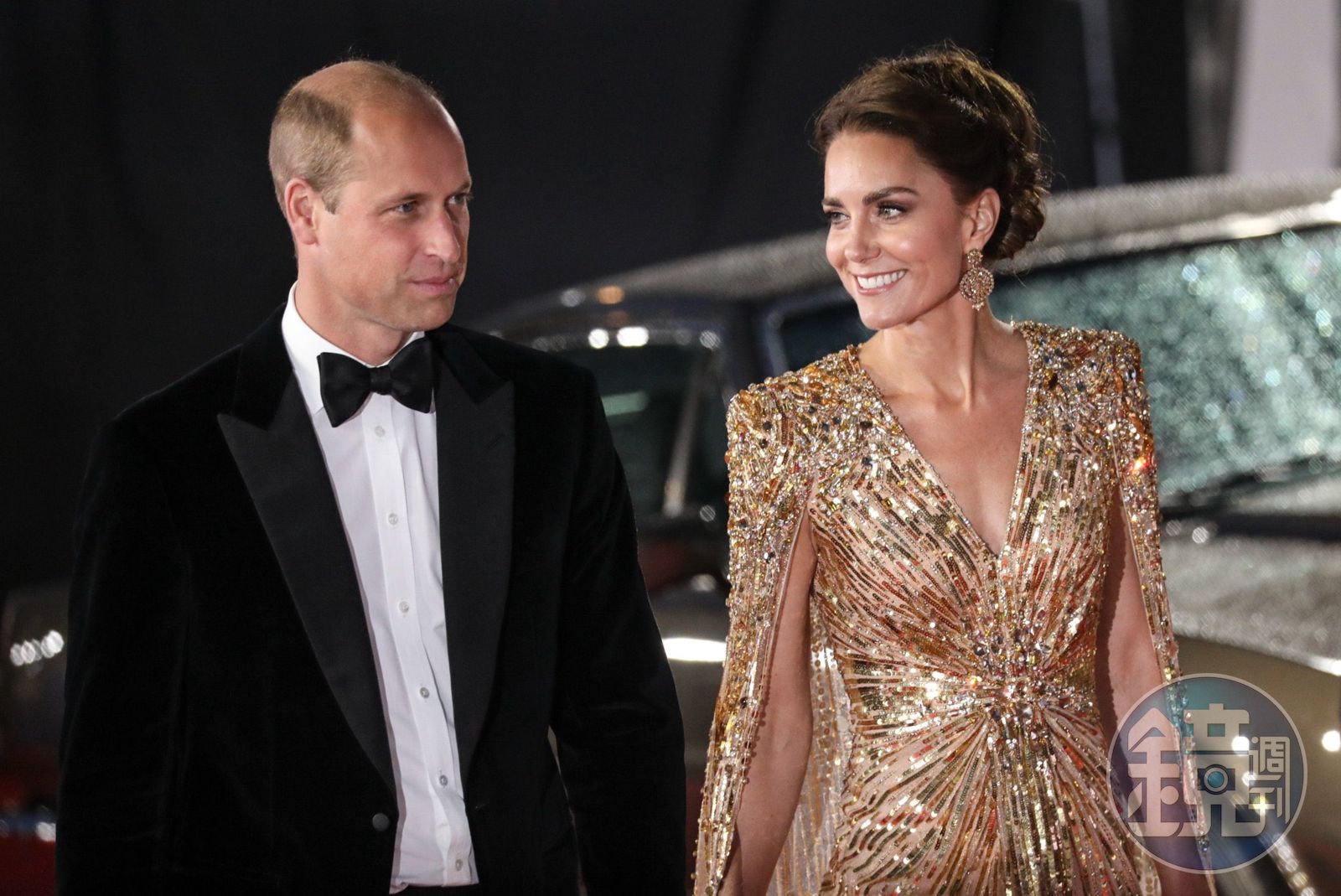 依照慣例,每部007電影世界首映都會邀請英國皇室,今年由查爾斯王儲和妻子卡蜜拉、威廉王子和凱特王妃代表出席。凱特王妃身穿愛牌Jenny Packham訂製金色亮片斗篷禮服,要價2,800英鎊(約新台幣10.5萬元),胸前開深V、收腰剪裁勾勒纖細曲線,修長雙腿在鎂光燈照射下若隱若現。