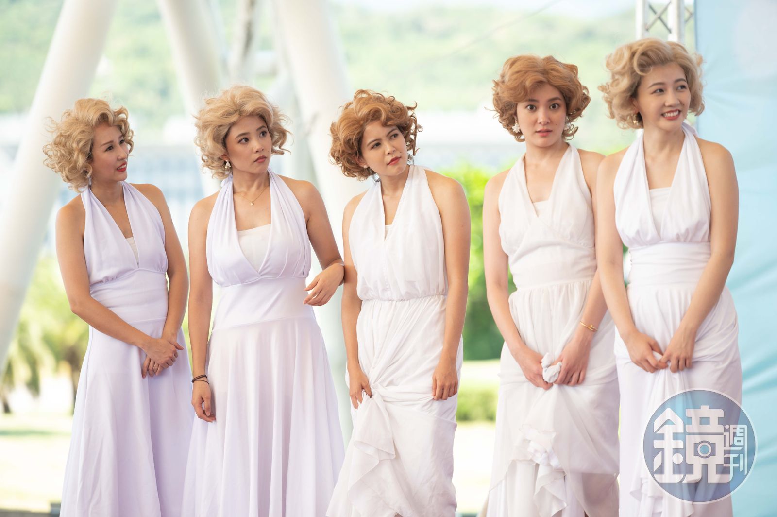 回想起拍攝扮演瑪麗蓮夢露,5位女生戴起假髮,穿起一樣造型,楊雅筑分享:「我們就像複製人非常顯眼,走去拍攝現場的路上,大家都納悶地盯著我們看,覺得很有趣。」劇中王上菲為取得拍攝MV機會,還特別墊胸、搶站C位:「編劇真的很替我想,我那天總共用了2個NUBRA,8個胸墊,墊出來有E罩杯哦。」過去總被大家笑停機坪的王上菲,第一次有E罩杯感受,還自開玩笑拿手機放在身上,一度疑似測不準距離,不小心胸部撞到別人,遭鯰魚哥虧:「妳不要過來哦,等一下被撞到消風。」不過也因當天天氣炎熱,胸墊墊了一整天讓她皮膚有點過敏起紅疹。