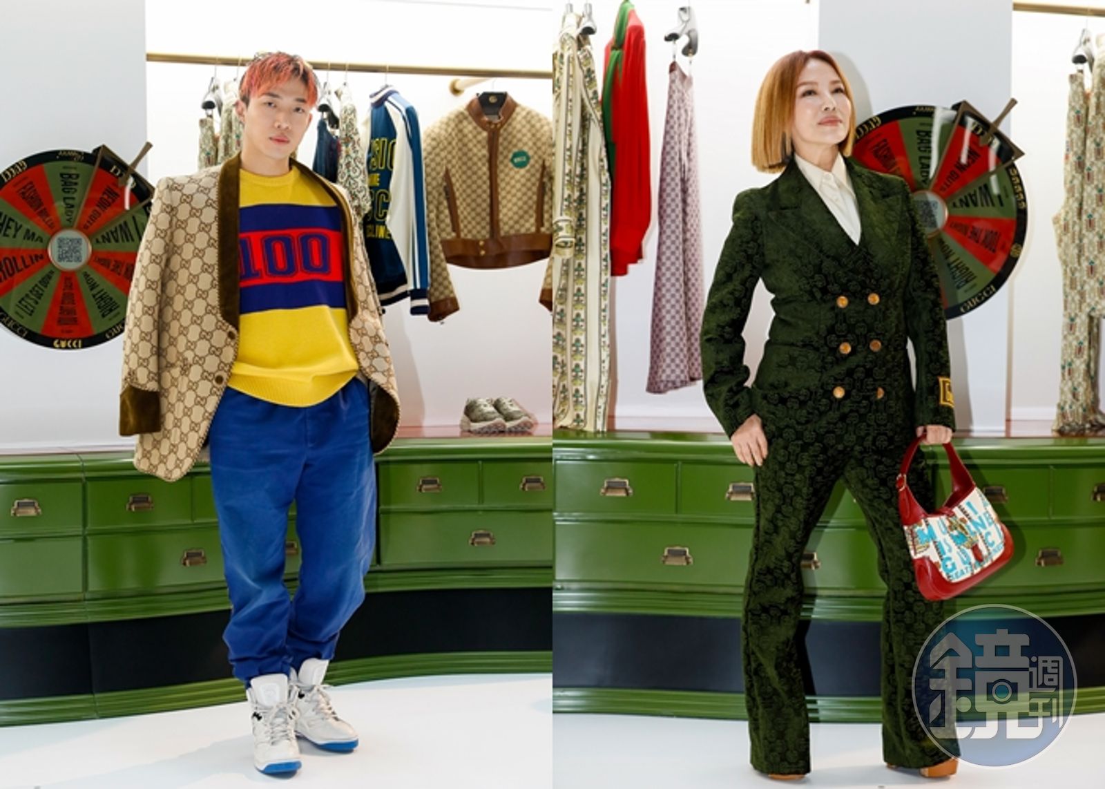 葉璦菱認為燈芯絨材質神氣也大器,她身上的GG緹花綠色外套NT$119,000,GG緹花綠色長褲NT$48,500,紅色印花肩背提包NT$78,000。葉璦菱則笑著透露,「ØZI有問我可不可以不要用以前的姿勢來拍照?他要我自然一點,說我的pose有年代感。其實我從他身上也學了很多,不過他口才比我好,很多時候我只是不講話,但心裡很多想法。」