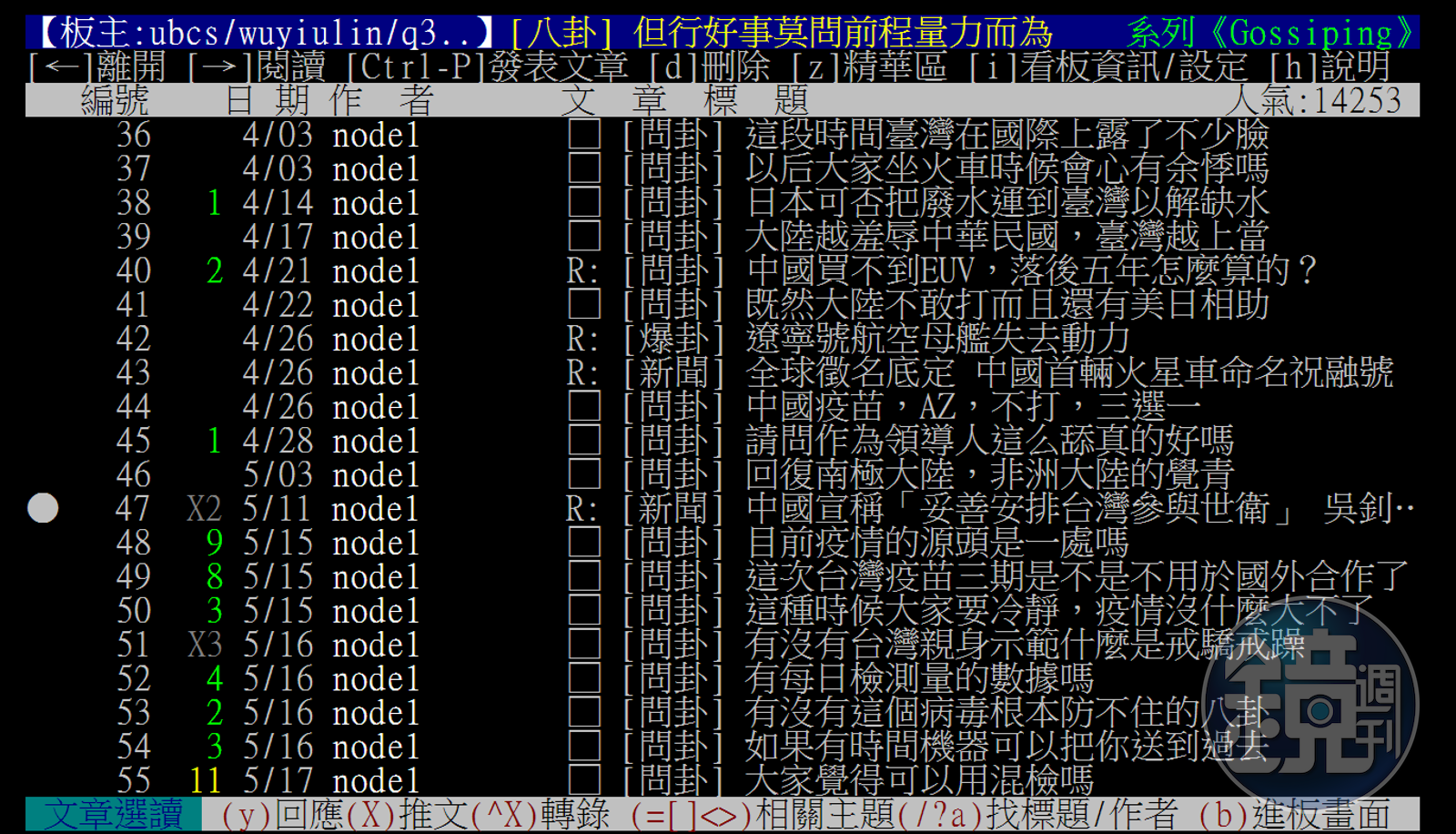 去年開始,他也跟著八卦版的大家,一起關心疫情、疫苗等話題,他很能跟上台灣防疫的時事,能用「校正回歸」這個名詞來開玩笑,也知道機師「3+11」的爭議。甚至他觀察到八卦版網友的主流意見並不支持國產疫苗後,還曾開玩笑發問:「八卦版風向變了,是不是中共的認知作戰?」