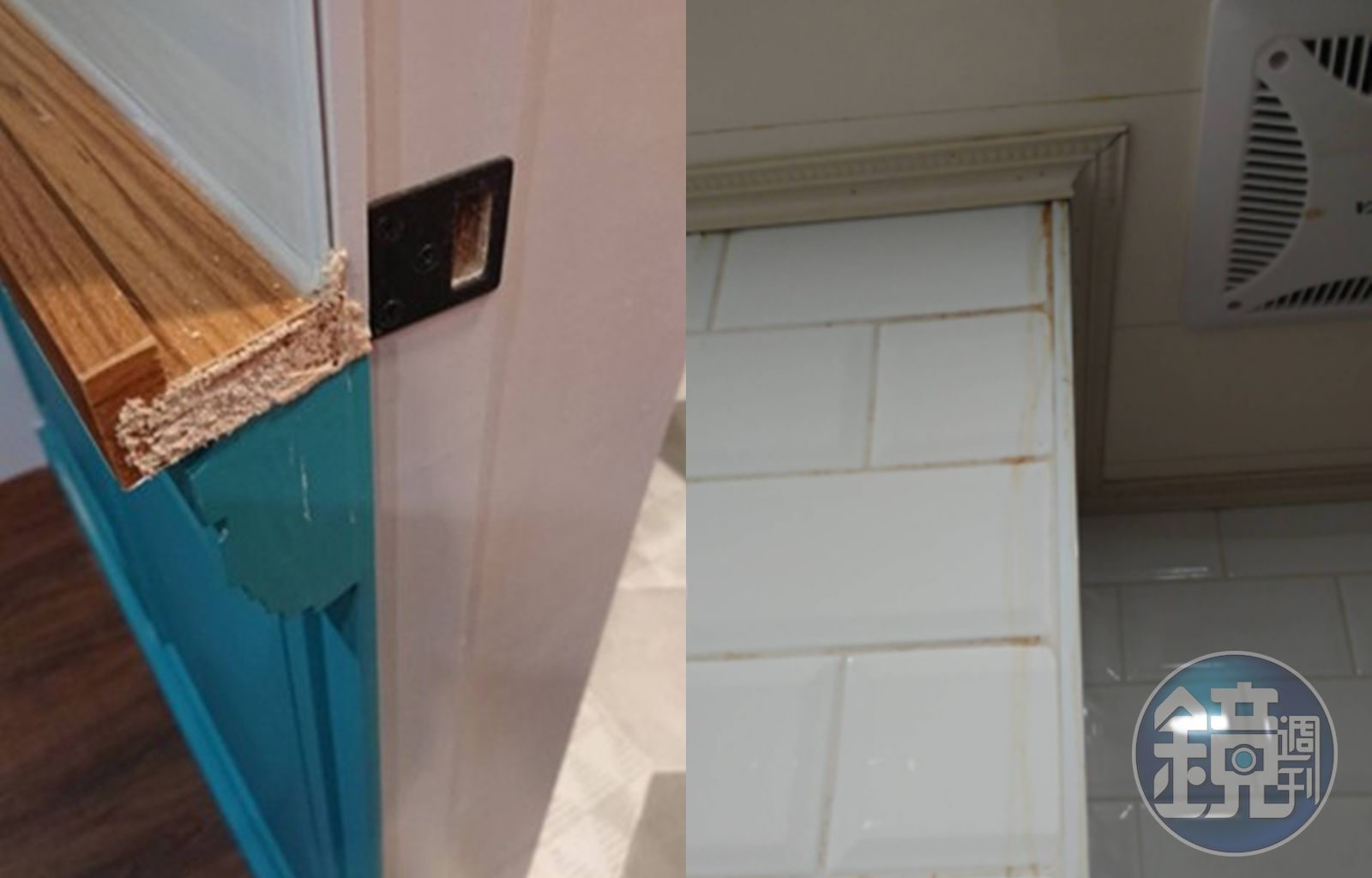 本刊檢視C先生出示的照片,只見裝潢木造的部分出現許多蟲蛀,斑駁和破洞的痕跡不少,甚至木板貼皮隆起龜裂;另外在浴廁的部分,天花板、牆面和地板也有不少漏水痕跡。C先生說,已經花費百萬元裝潢,提告後,還必須出示第三方公正單位的鑑定結果,又得再花一次錢,實在是被當冤大頭。