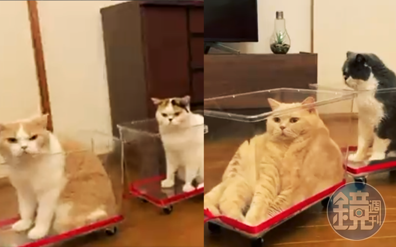 在推特上有數十萬粉絲,前陣子也因貓咪淡定躺在水桶裡,引發網友討論起「原來貓是用桶計算」話題的5隻貓網紅家族「蜜柑與次郎(みかんとじろうさんち)」,最近又有新作。因為日本剛於電視首播《鬼滅之刃-無限列車篇》,於是飼主就將5隻貓分別放在附輪子的透明箱中,用繩子串起來出動「無限貓列車」。