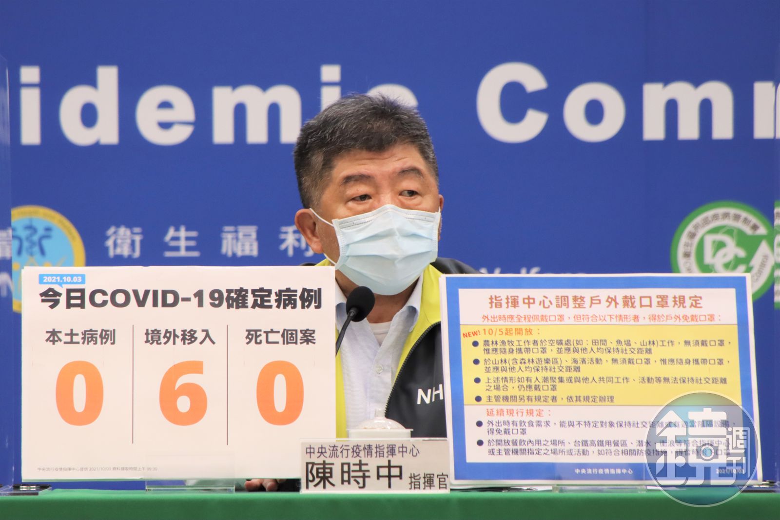 陳時中說明,自10月5日起,農林漁牧工作者於空曠處,如田間、魚塭、山林工作時「無須戴口罩」,但身上仍需攜帶口罩,有其他人出現就要戴起來,並與他人保持社交距離。