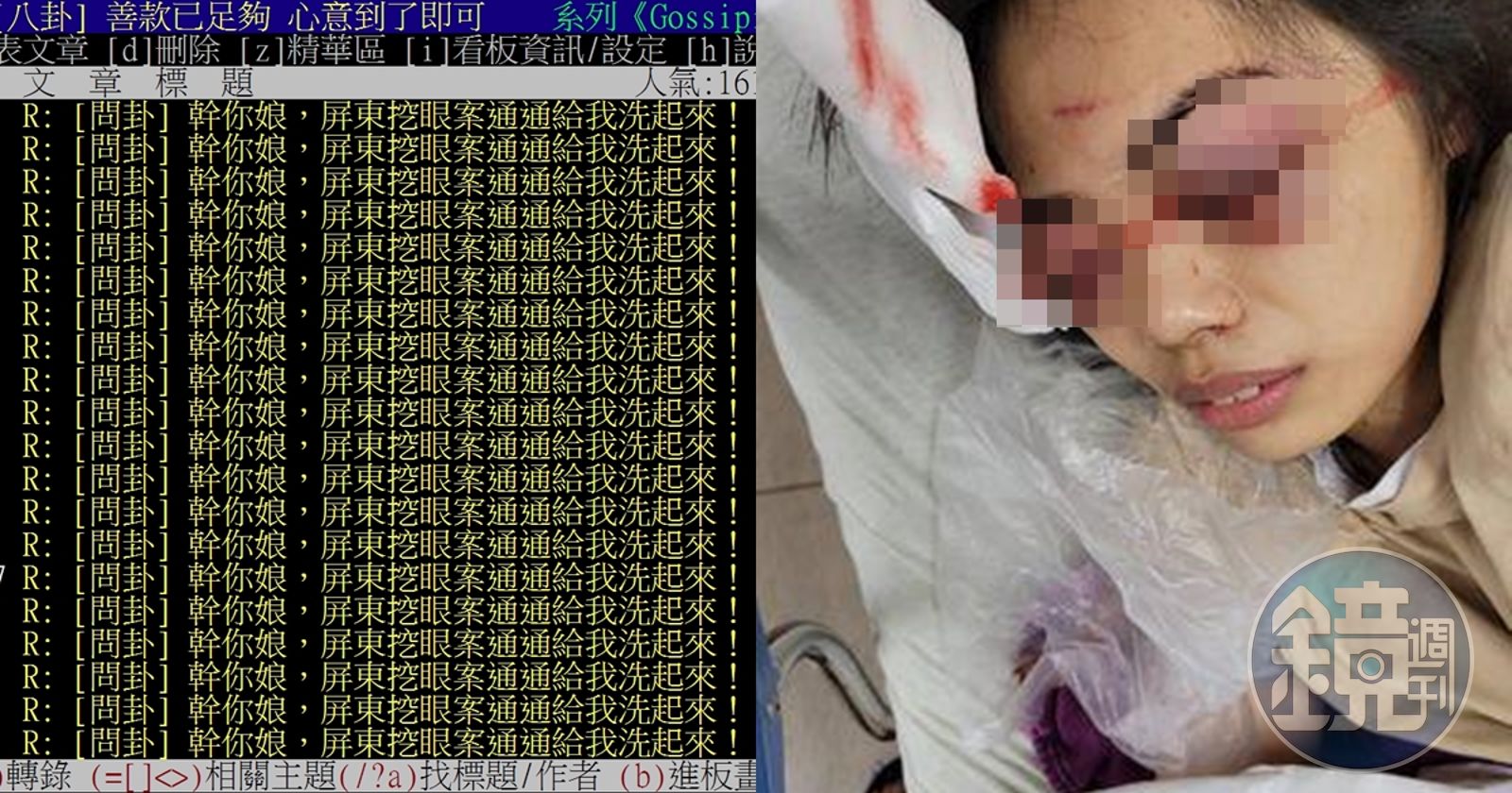 一名鄉民在PTT八卦版以〈X你娘,屏東挖眼案通通給我洗起來!〉為題,表示這麼嚴重的社會案件,最近卻被八卦新聞掩蓋了,「你們這些小朋友還在那邊洗啥雜魚的恩怨情仇,有沒有搞錯?」要大家「通通給我洗起來!」