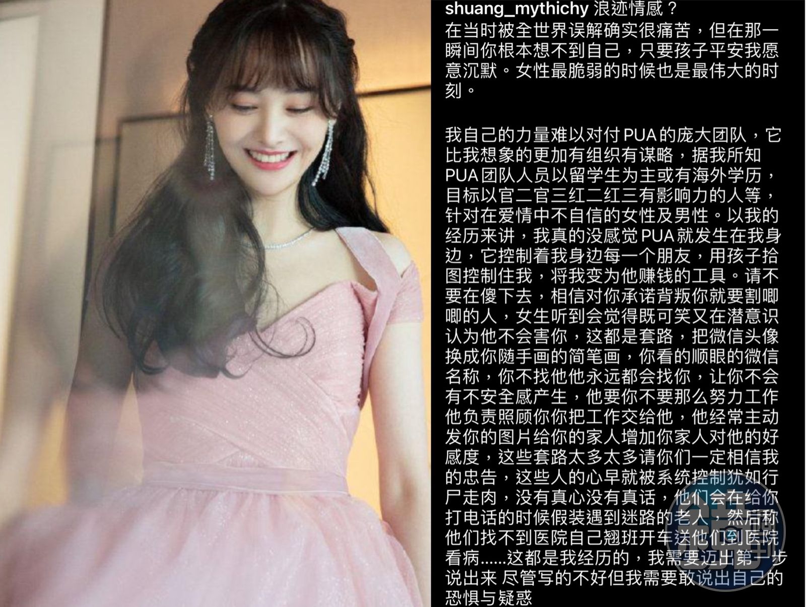 鄭爽4日在IG發文寫道,「它控制著我身邊每一個朋友,用孩子拾(試)圖控制住我,將我變為他賺錢的工具。」她一一指證前男友所做過的行為,包括經常發照片給自己的家人以增加好感、在打電話的時候假裝遇到迷路老人等,「這些套路太多太多,請你們一定相信我的忠告,這些人的心早就被系統控制,猶如行屍走肉,沒有真心、沒有真話。」指控前男友的言行都是被PUA組織「訓練」出來的。