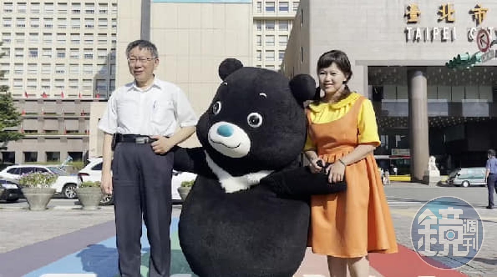 游淑慧昨天穿著《魷魚遊戲》中詭異娃娃的黃橘色吊帶裙,與柯文哲、熊讚、北市副發言人黃瀞瑩、魏佑任等人一起在北市府前廣場拍攝「熊好券」的宣傳影片。