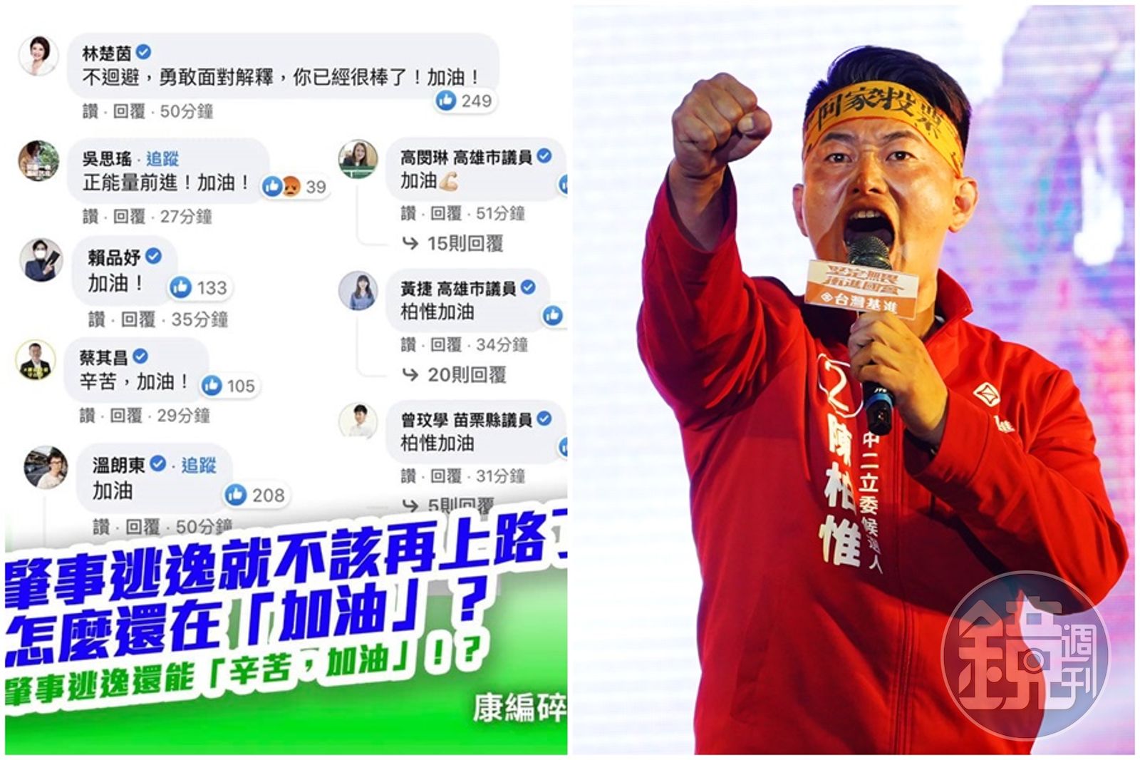 就有PTT網友統整來自大咖政黨、演藝圈以及名嘴留言加油截圖,其中包含立法院副院長蔡其昌、立委許淑華、立委賴品妤、立委林楚茵、立委吳思瑤、立委洪申翰、議員黃捷、議員曾玟學、以及總統府國策顧問魏明谷等人,都紛紛出面力挺陳柏惟,直喊「加油」,就連「焦糖哥哥」陳嘉行也暖心鼓勵,「面對錯誤、坦承錯誤,然後讓自己成為對國家社會有幫助的人,柏惟,加油!」曾因竊盜、公共危險、毀損等罪嫌起訴的藝人柯宇綸也暖喊加油。