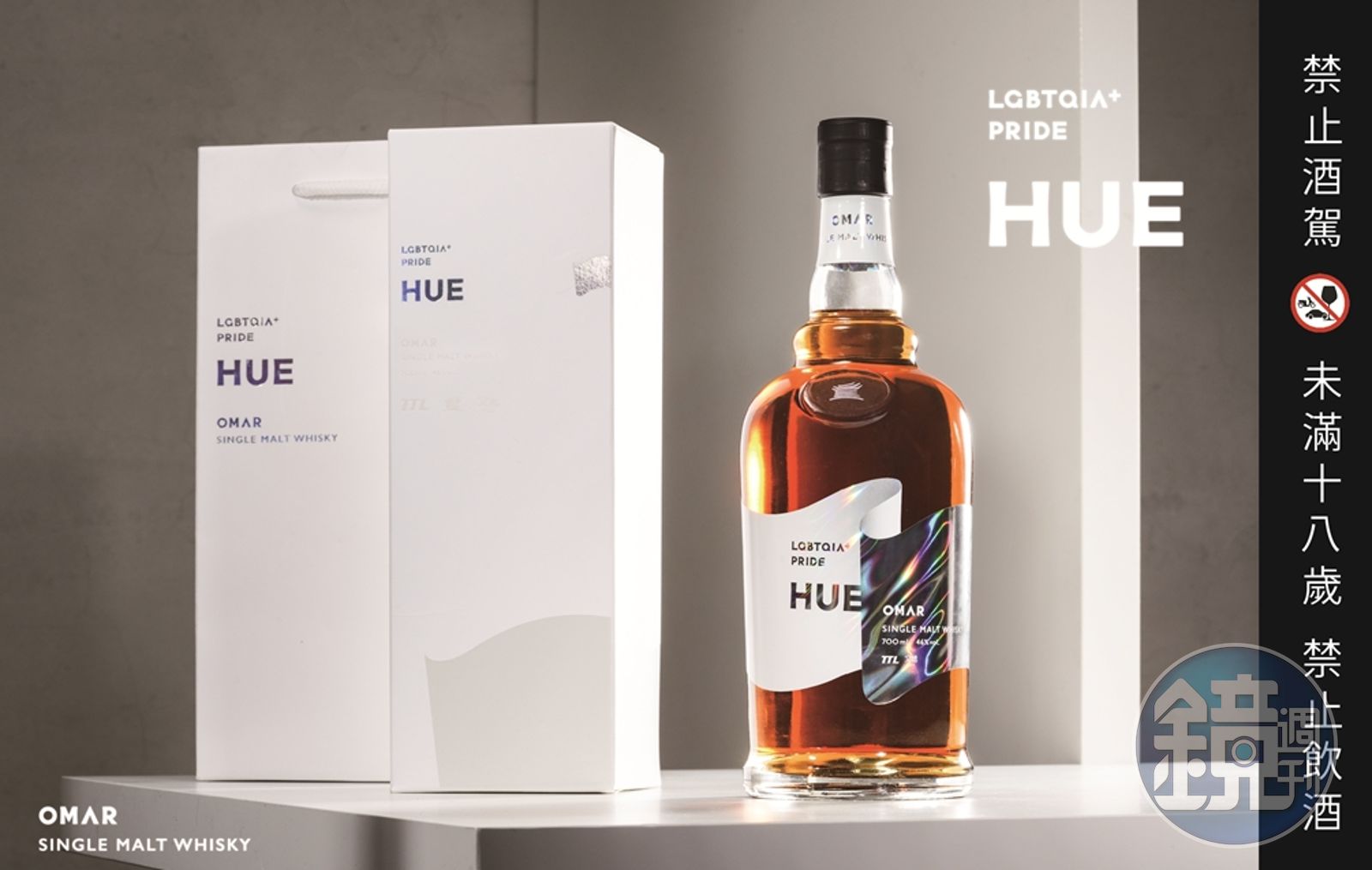 「HUE」酒標設計上,則邀請到具多次合作經驗的設計師方序中,選用特殊的雷射貼標,在光線映照下折射出如彩虹般的閃耀霓光,象徵驕傲飄揚的彩虹旗,並與OMAR威士忌醇厚溫潤的酒色相互輝映「當所有顏色匯集時,我們就成為光芒」。