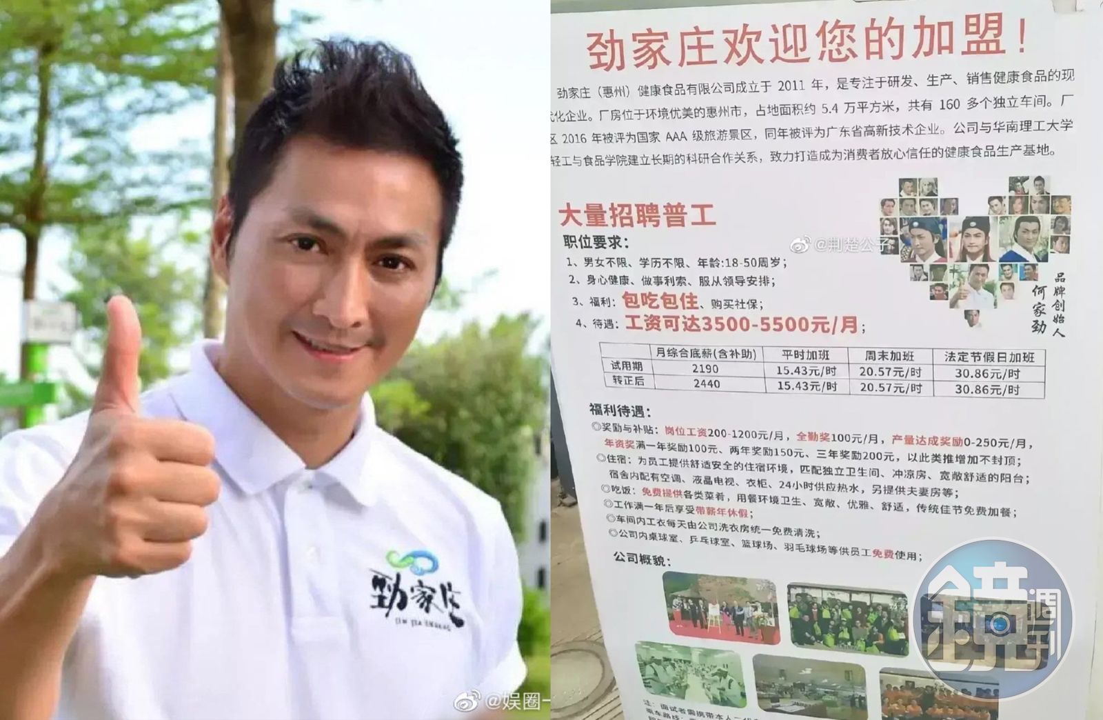 10月4日,有網友在微博上分享了一則徵才啟事,何家勁旗下的食品加工廠「勁家莊」要徵人了,該工廠招聘大量「普工」,月薪3,500至5,500人民幣(約新台幣1.5至2.4萬元),還包吃包住帶社會保險。消息一曝光,卻意外引發中國各地網友熱烈討論,有部分住在一、二線城市的網友就認為何家勁開工廠賺進大把鈔票,質疑工資給的太低,笑譏「沒想到展昭這麼黑,包拯是臉黑,他是心黑。」
