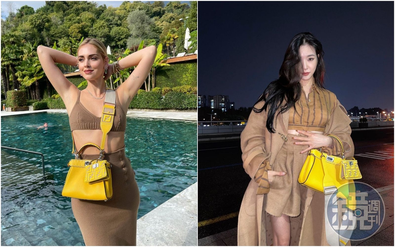 (左起)Chiara Ferragni、韓國的Tiffany已經率先示範含羞草黃Peekaboo限定系列。(翻攝自Chiara Ferragni與Tiffany IG)發布時間:2021.10.11 11:07 臺北時間