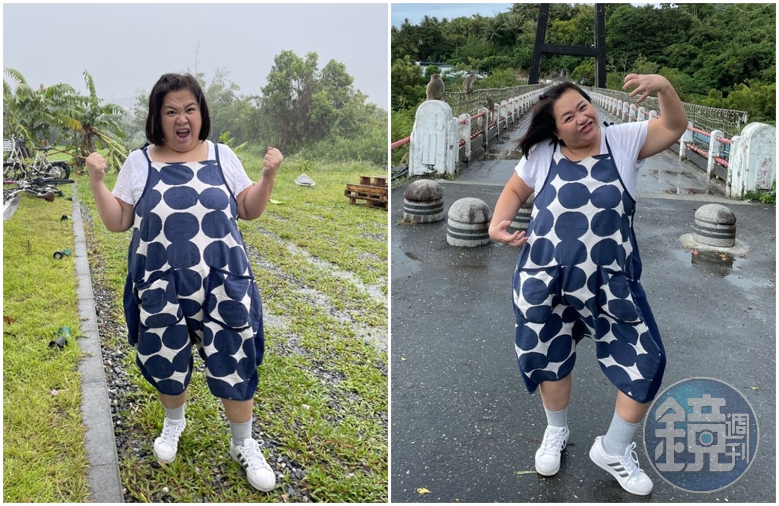 沒想到她今天現身台東,好山好水的背景下,風力強大,連身後的腳踏車都倒了,她說「我第一次在台東遇上颱風,第一次身歷其境超強風,在台北常常因為中央山脈阻擋,風雨減弱不少。」