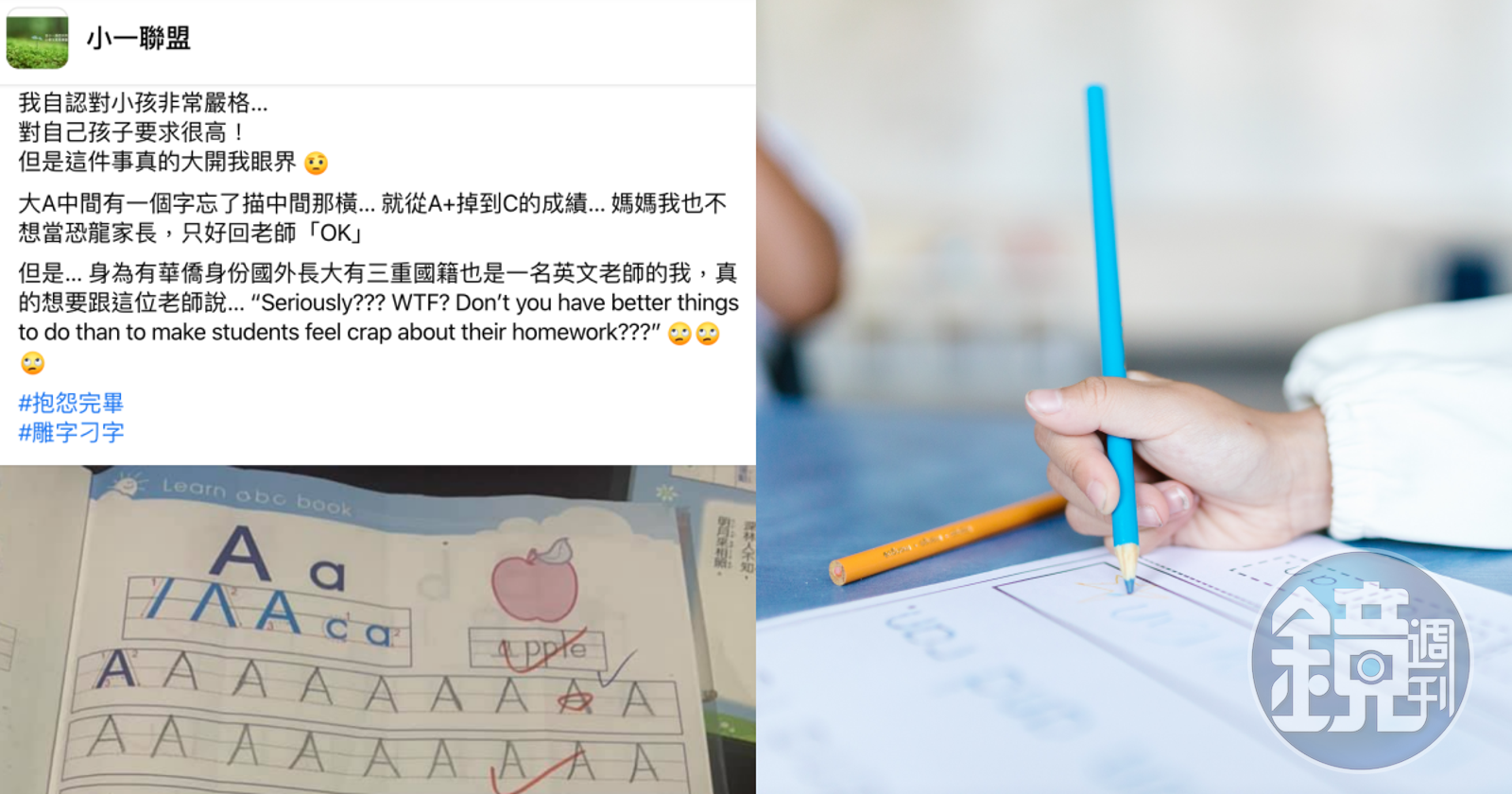 一名媽媽在臉書社團「小一聯盟」發文指出,孩子的英文作業練習寫字母A,其中1個A忘了寫上中間一橫,就被老師打上C的成績,還寫上評語「太可惜!沒有錯的話你會A+」,原PO不想跟老師起衝突,只好簡單回覆老師「OK」,但她忍不住上網抱怨,直言自己也是英文老師,「比起讓學生對作業感到挫折,難道你(老師)沒有其他事好做了嗎?」